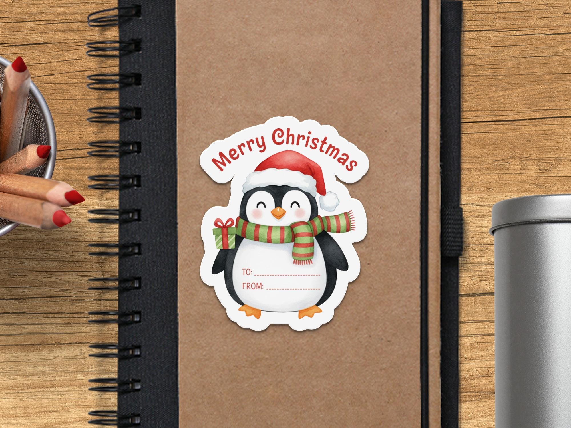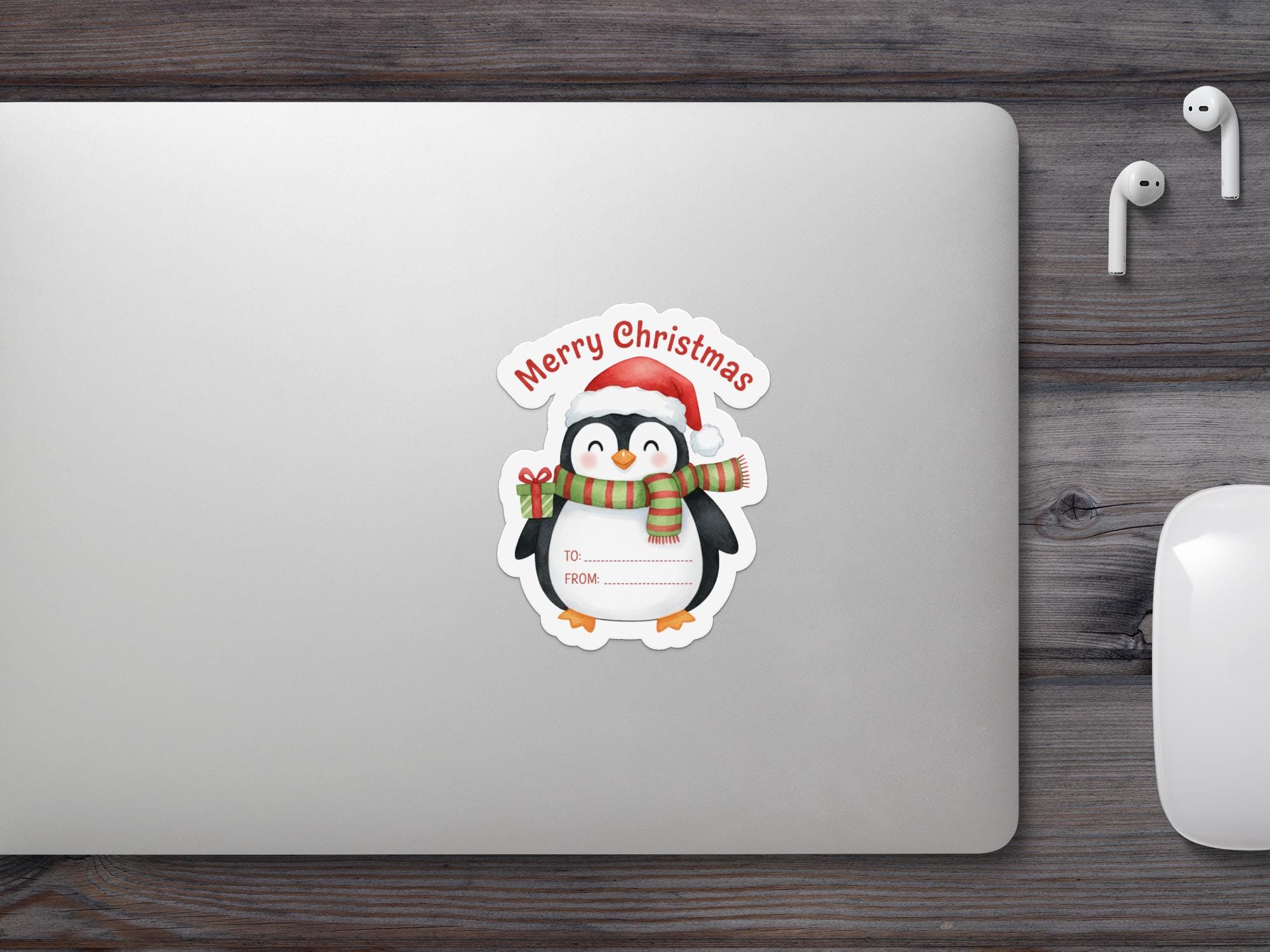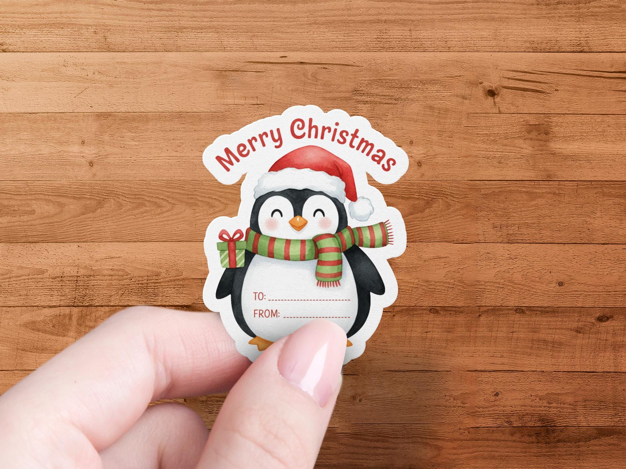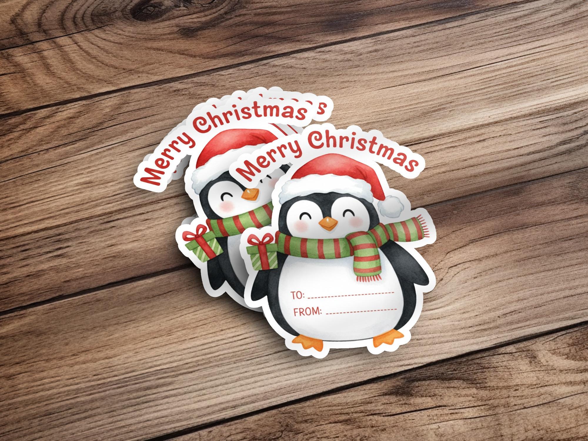 Add a touch of holiday cheer to your gifts with these adorable Christmas penguin stickers! This delightful design features a charming penguin wearing a Santa hat and scarf, holding a present, and ready to spread some Christmas joy. Perfect for adding a festive touch to your presents, cards, and other holiday creations.