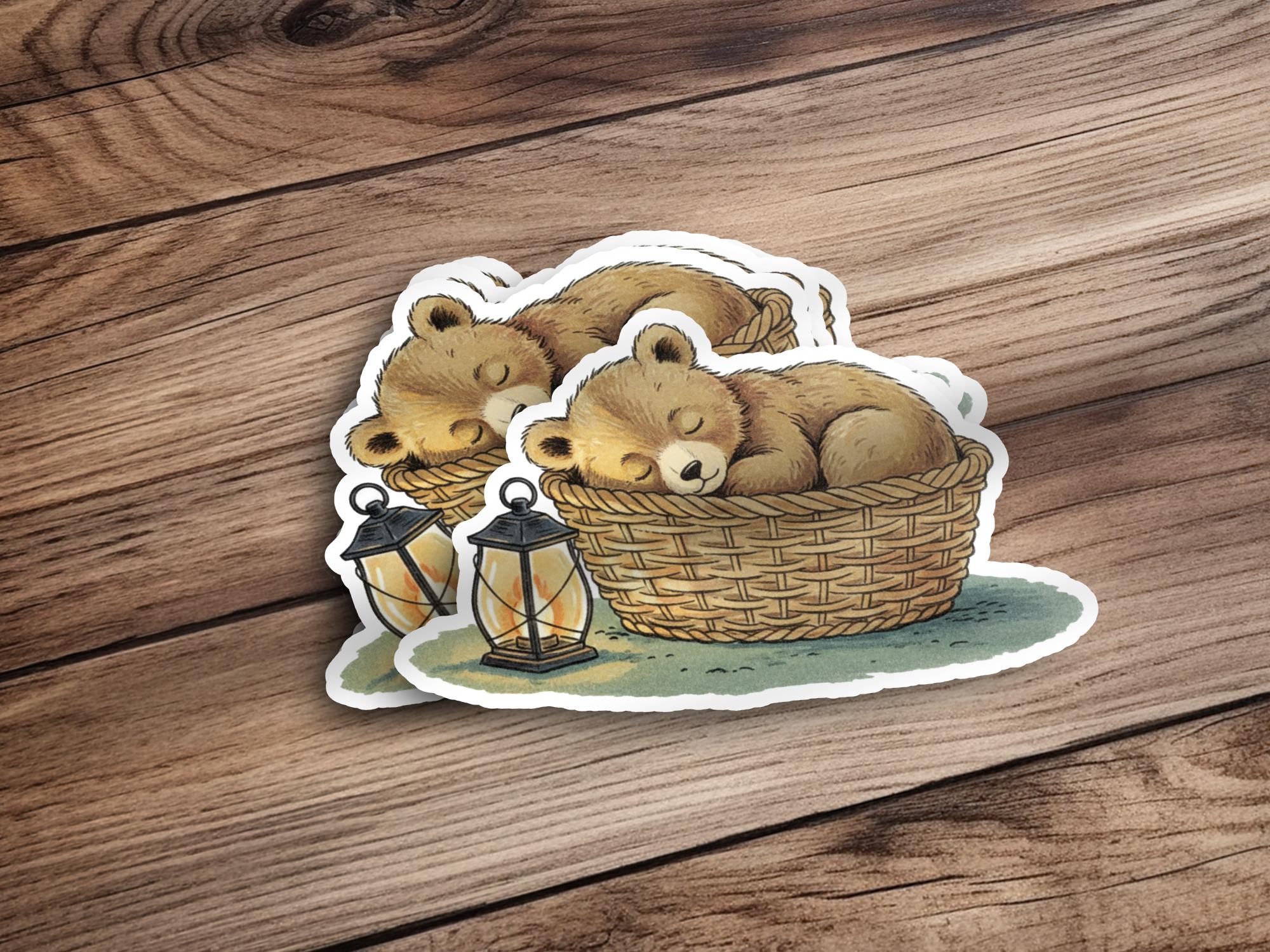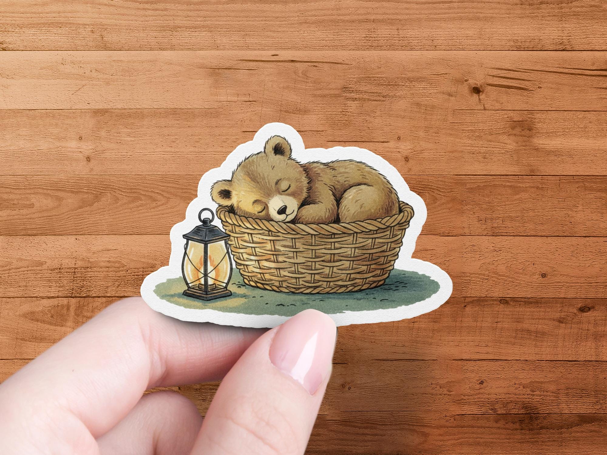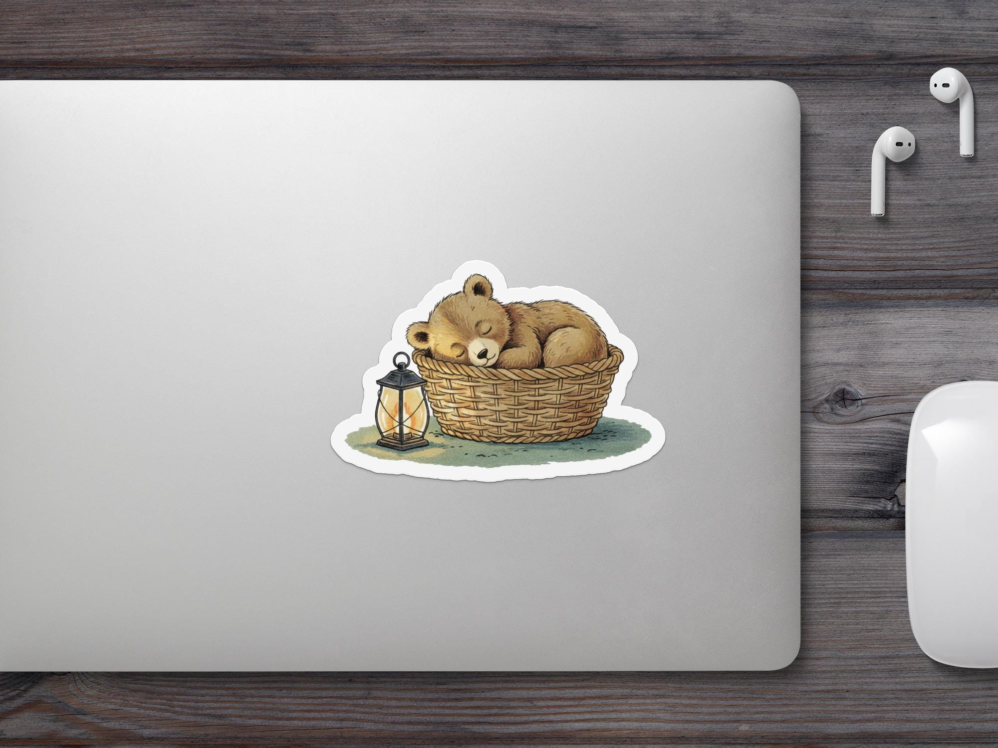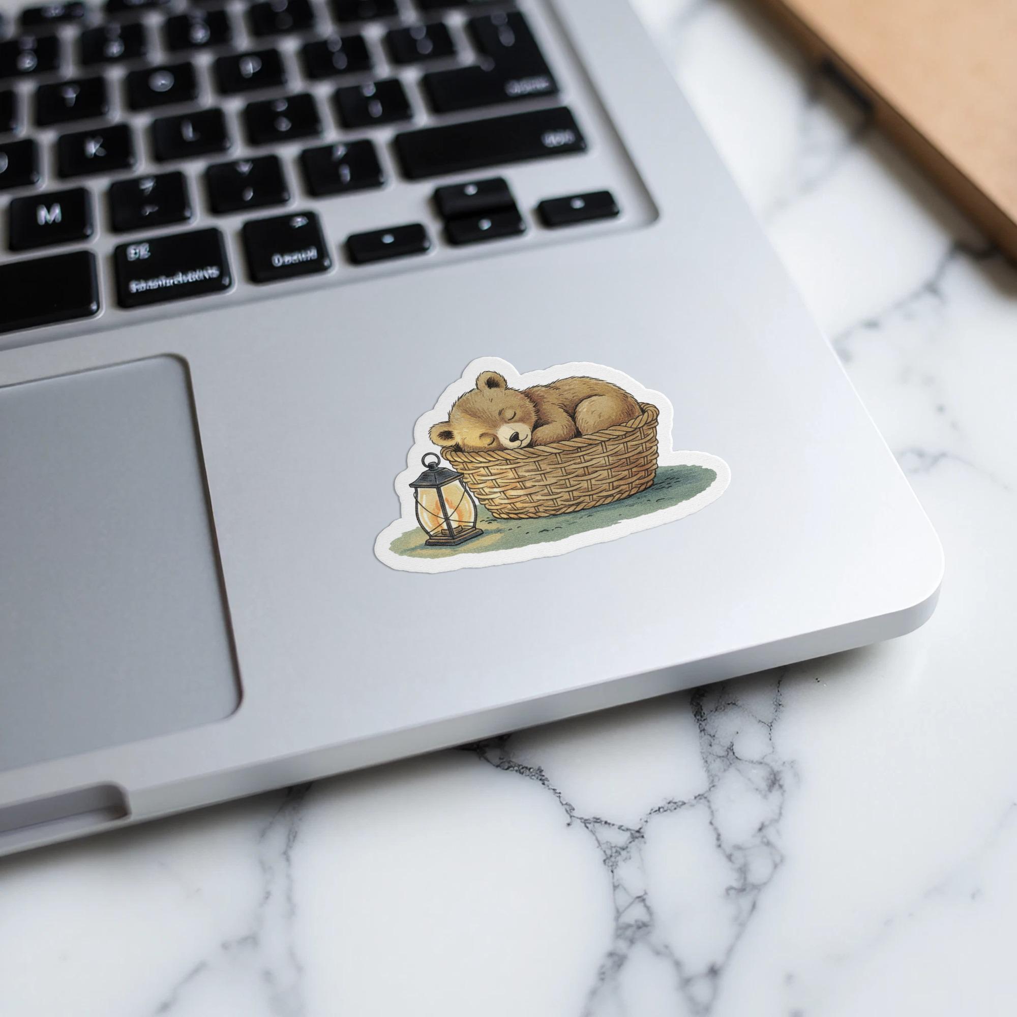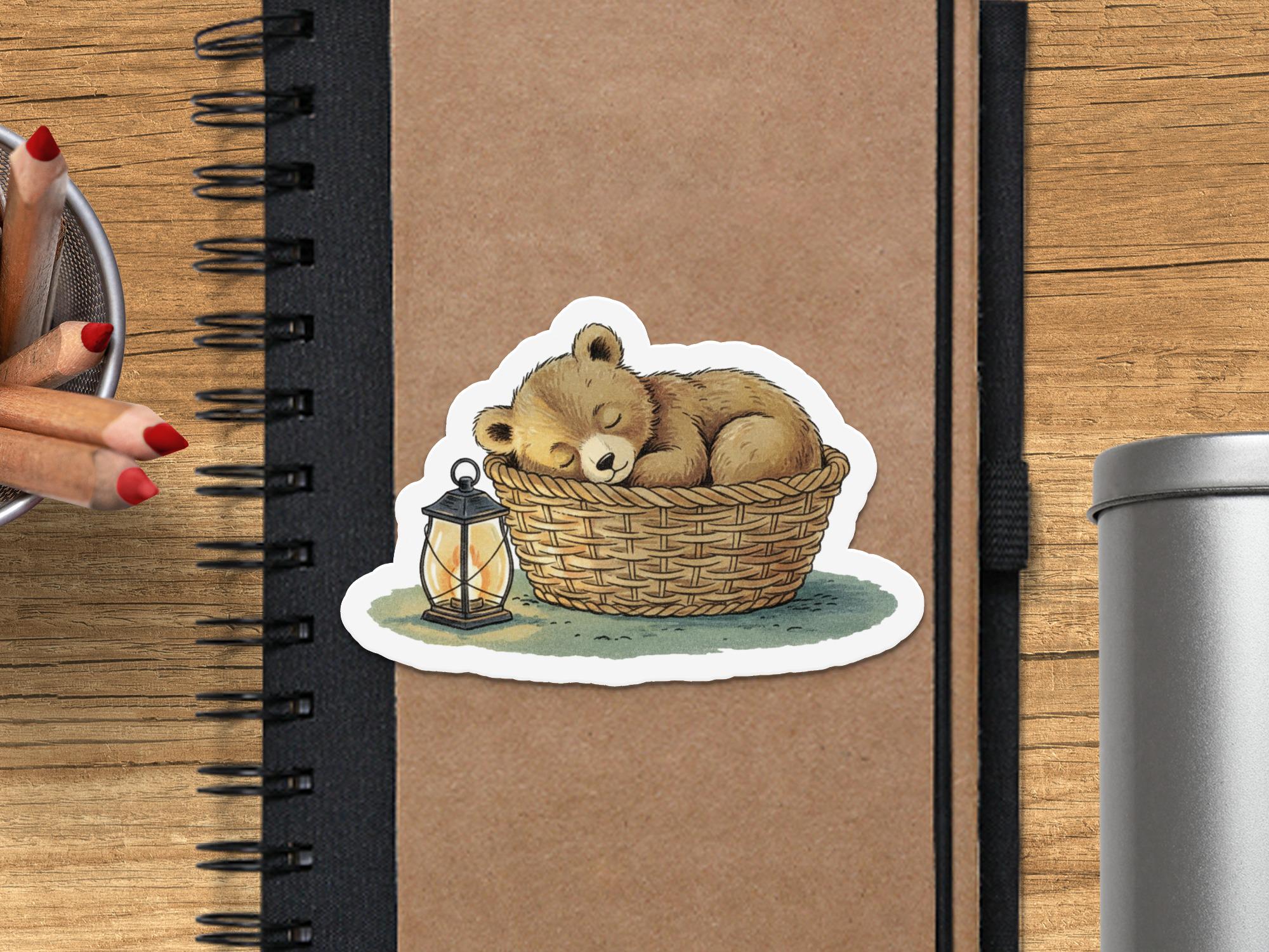 Bring a touch of heartwarming charm to your belongings with this adorable bear sticker. Featuring a sweet baby bear fast asleep in a woven basket beside a glowing lantern, this delightful design is perfect for adding a touch of coziness to any surface. Whether you're decorating a laptop, water bottle, or notebook, this sticker will bring a smile to your face.