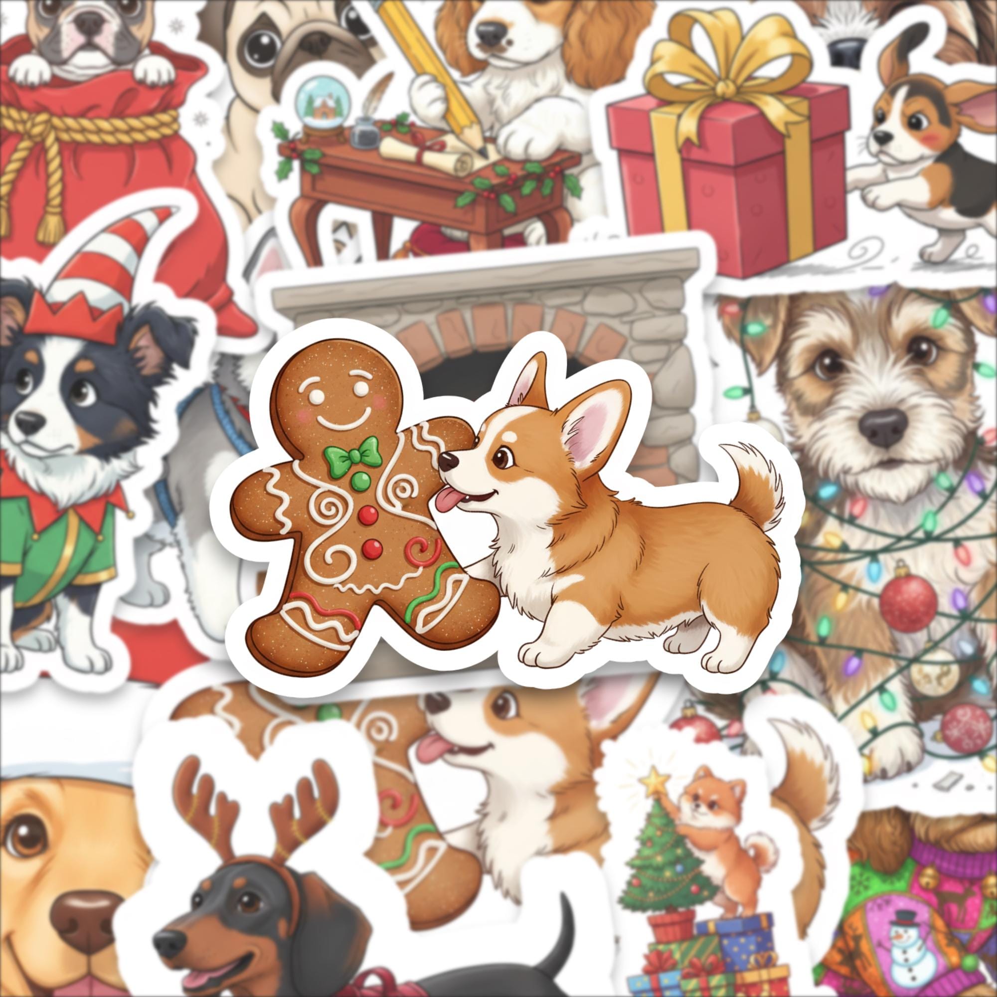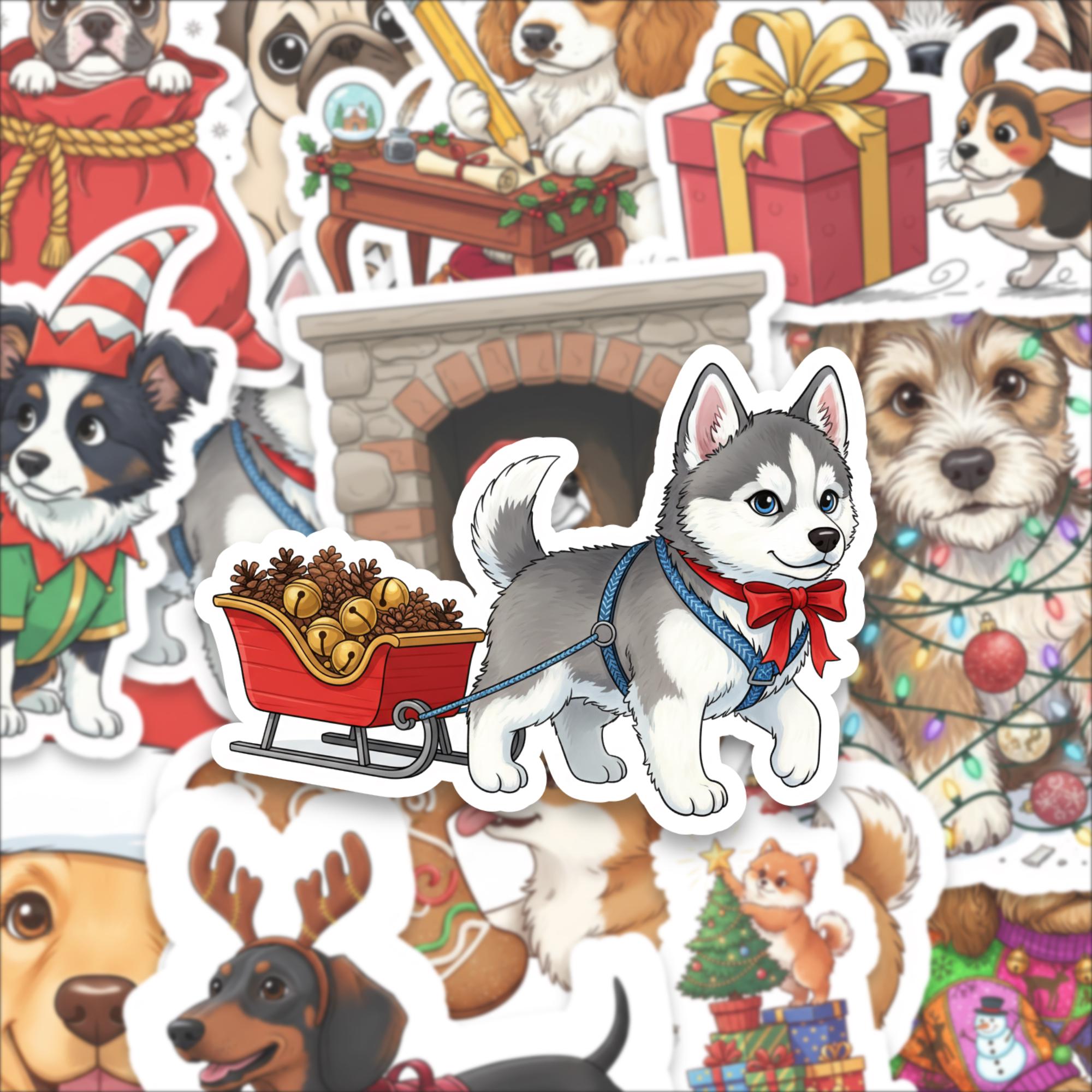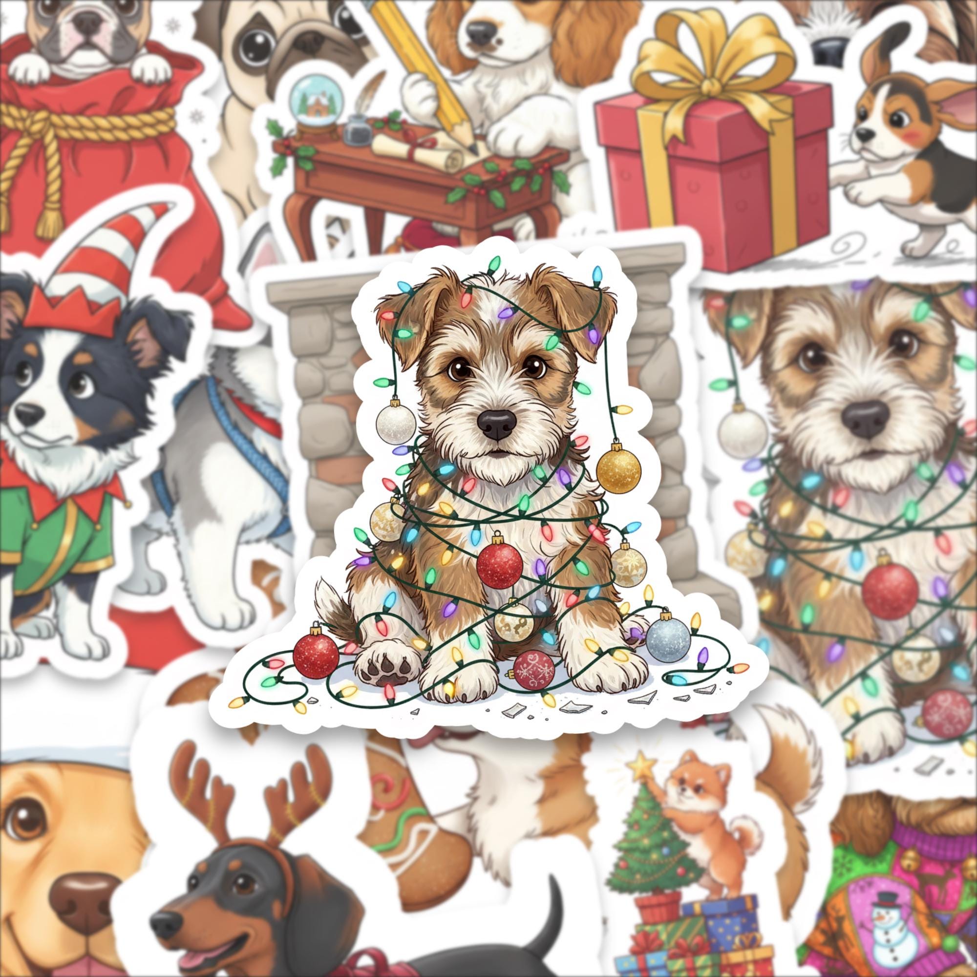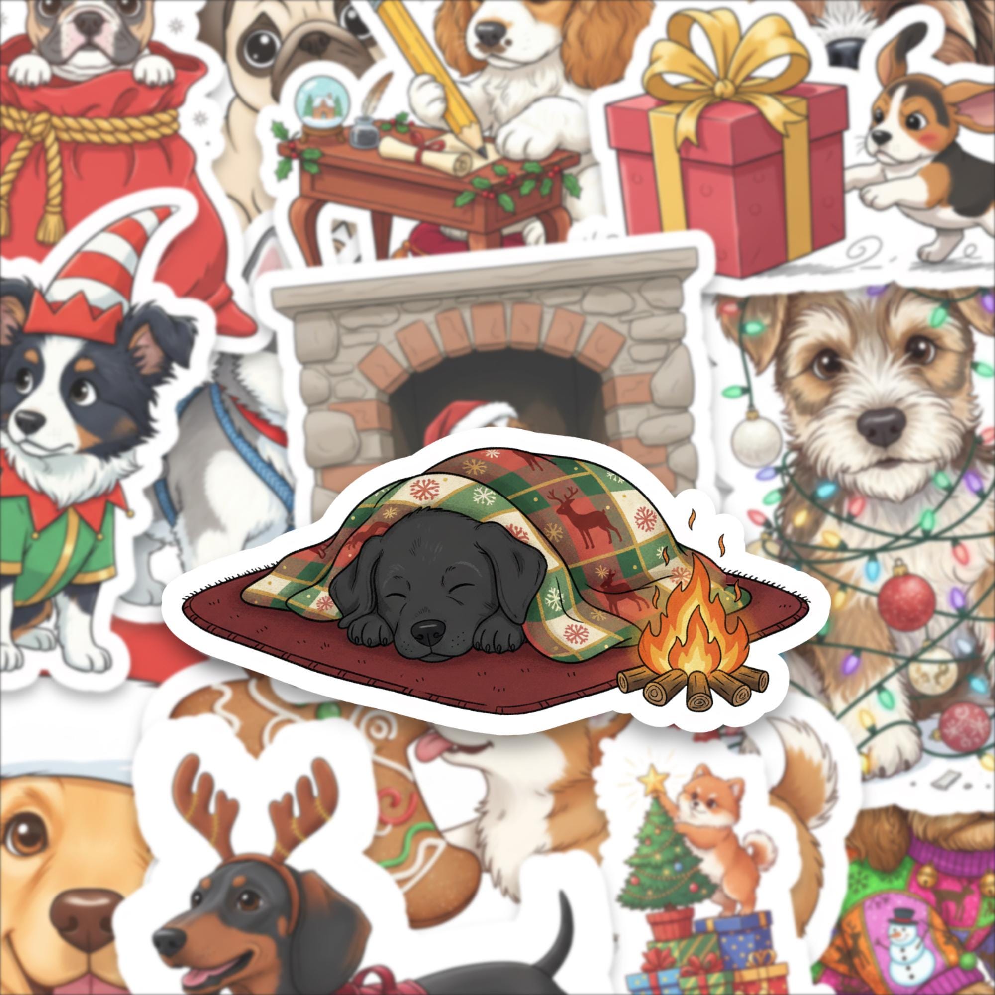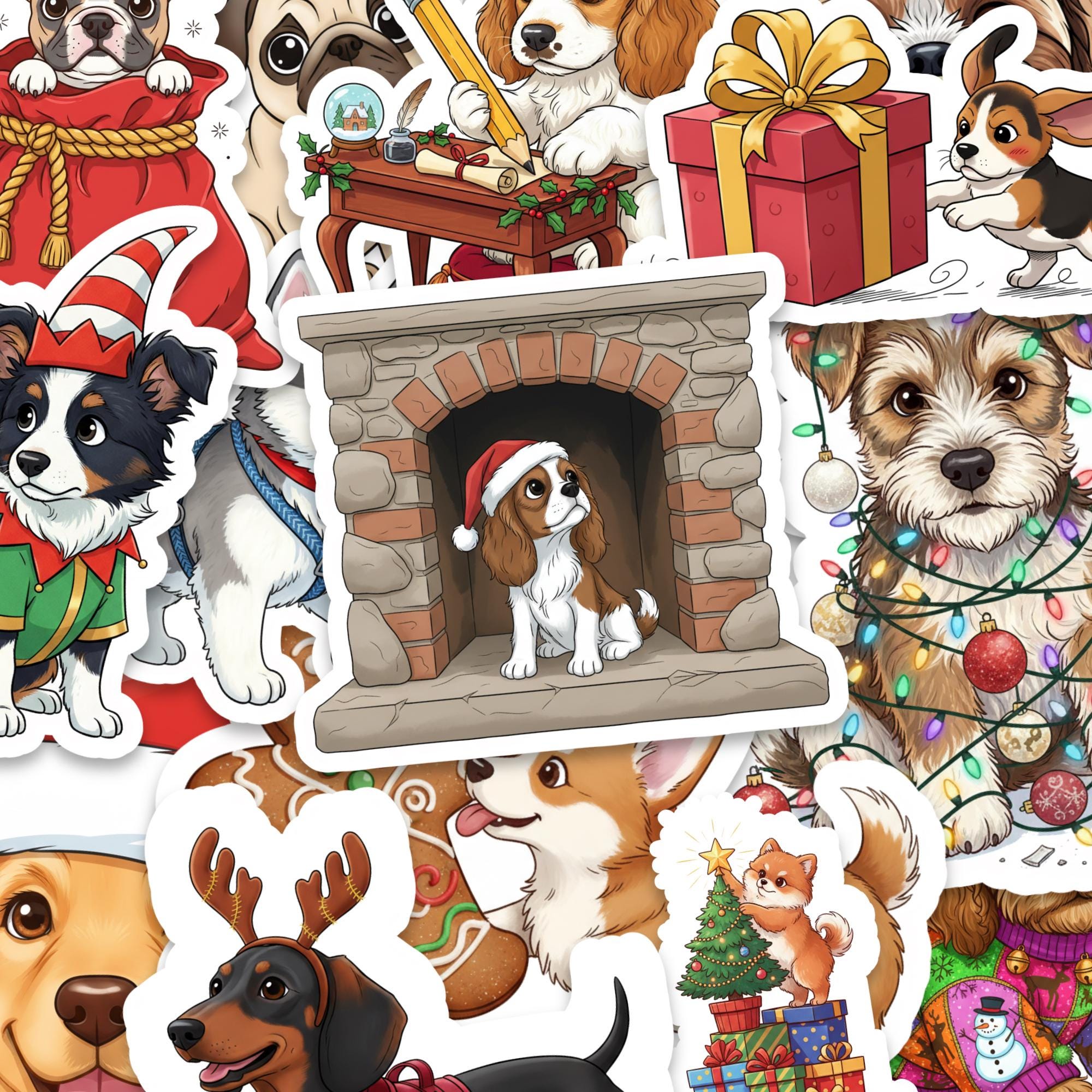 Bring home pure holiday joy with this Christmas dog sticker pack — a charming 15-piece collection of illustrated puppy stickers designed to brighten planners, gifts, journals, laptops, and festive décor. Each dog is captured in adorable holiday scenes, from twinkling lights to cozy fireplaces, wrapping presents, baking cookies, and celebrating the magic of the season.