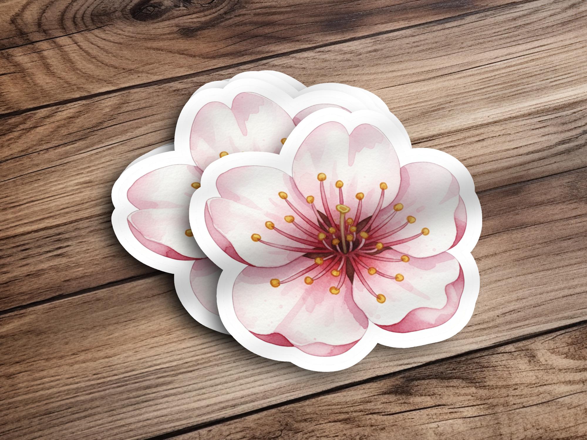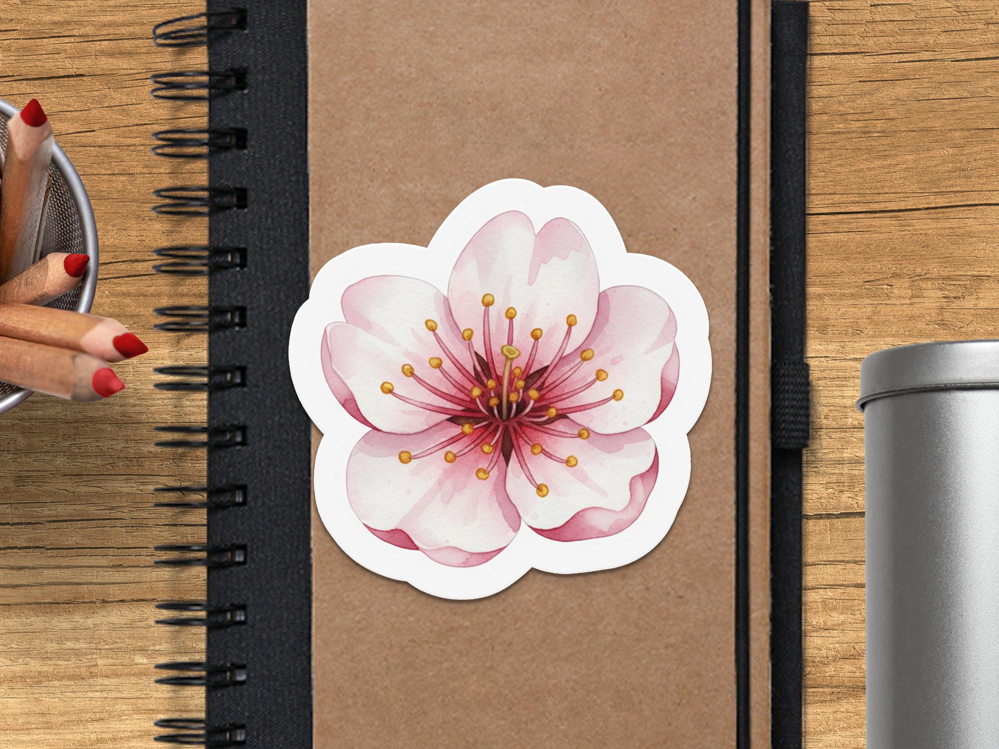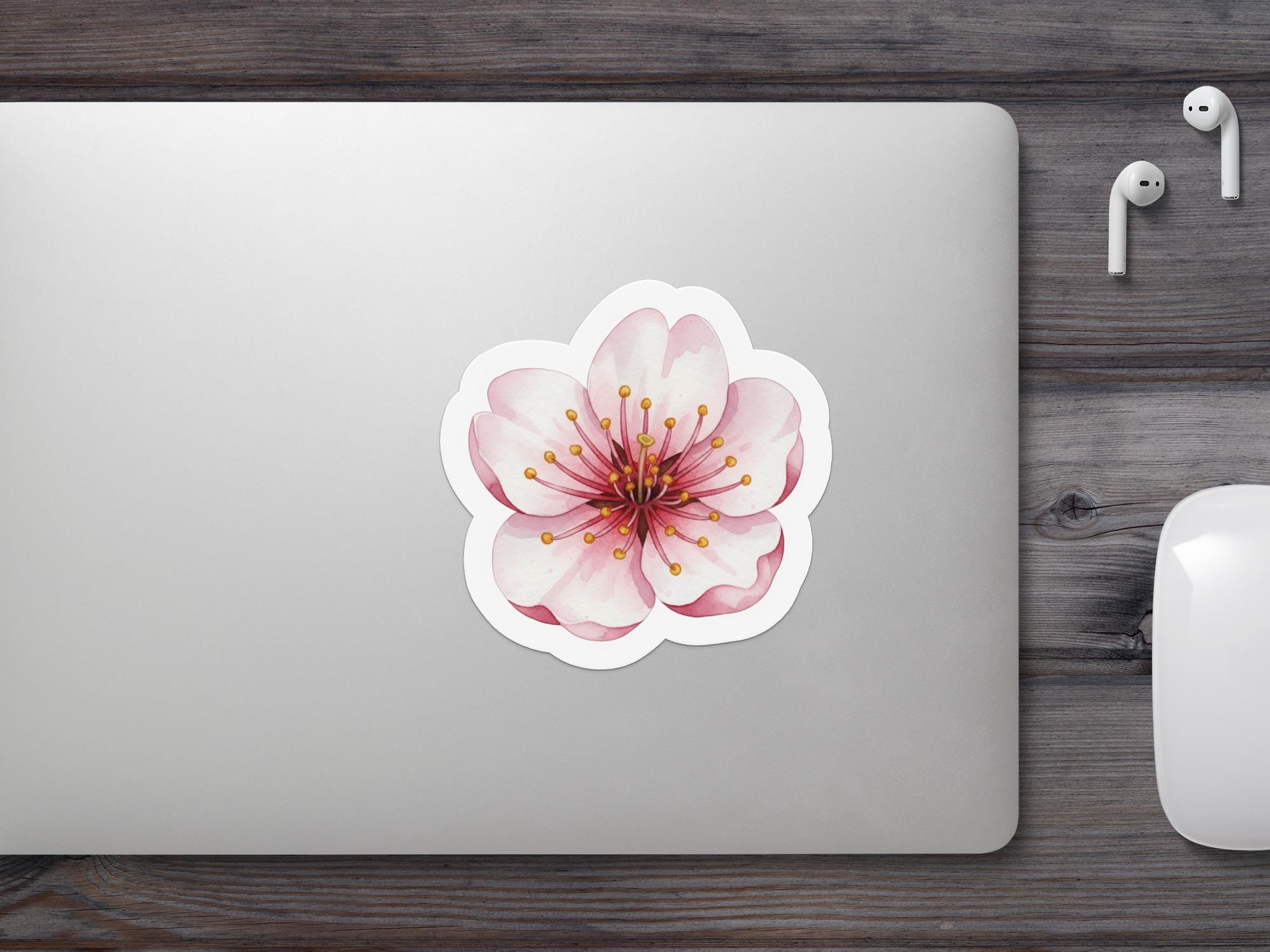 This glossy sakura blossom die cut sticker captures the quiet beauty of spring in one delicate bloom. Its soft pink petals and golden stamens glow under a smooth, high-shine finish, bringing a fresh, serene touch to your laptop, journal, water bottle or phone case.