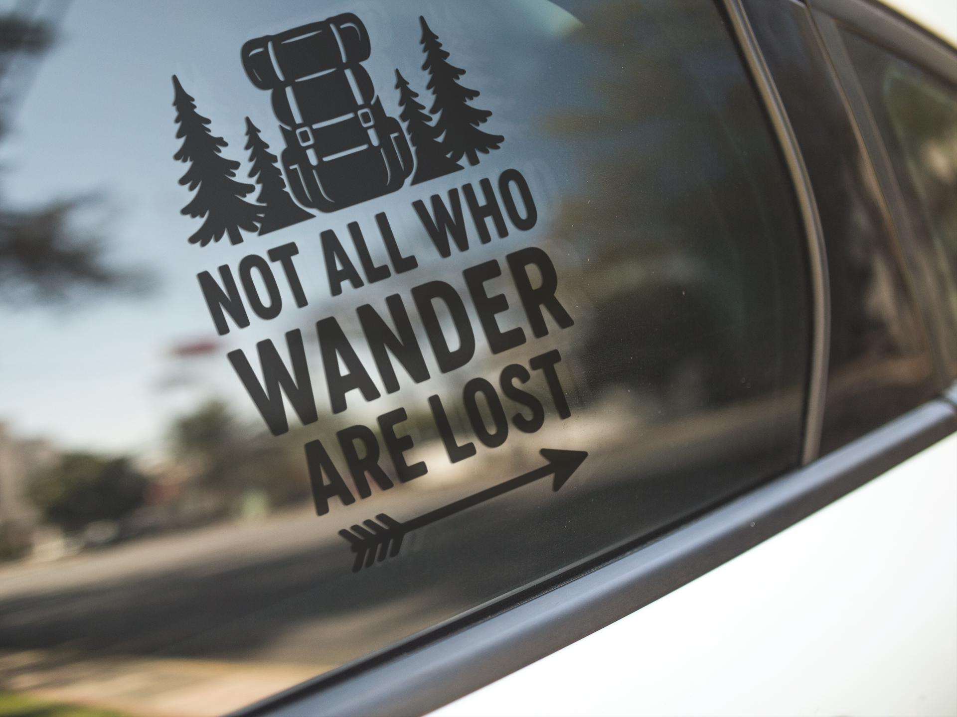 This hiking quote vinyl decal brings the spirit of adventure to your everyday spaces, featuring the iconic “Not All Who Wander Are Lost” design with a backpack and forest silhouette. Crafted from durable vinyl, this decal adds personality to cars, laptops, windows, water bottles, campers, and more.