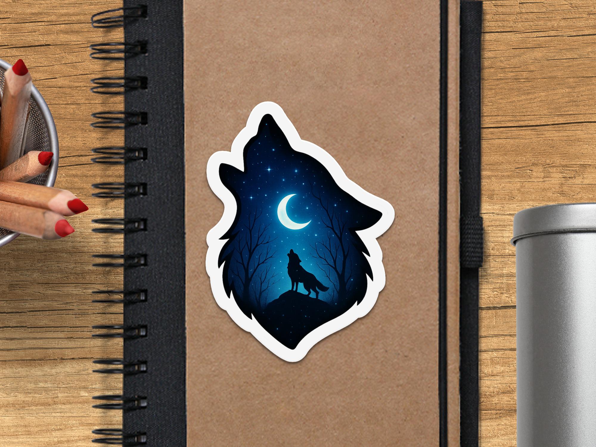 Printed on premium glossy sticker material with a crisp white border, this die cut design showcases deep blues, twinkling stars, bare forest trees, and a bold lunar glow that stands out beautifully on laptops, notebooks, water bottles, phone cases, sketchbooks, journals, and more. The silhouette shape feels artistic and intentional, letting you express your love for wolves, nature, and night skies in a single, eye catching detail.
