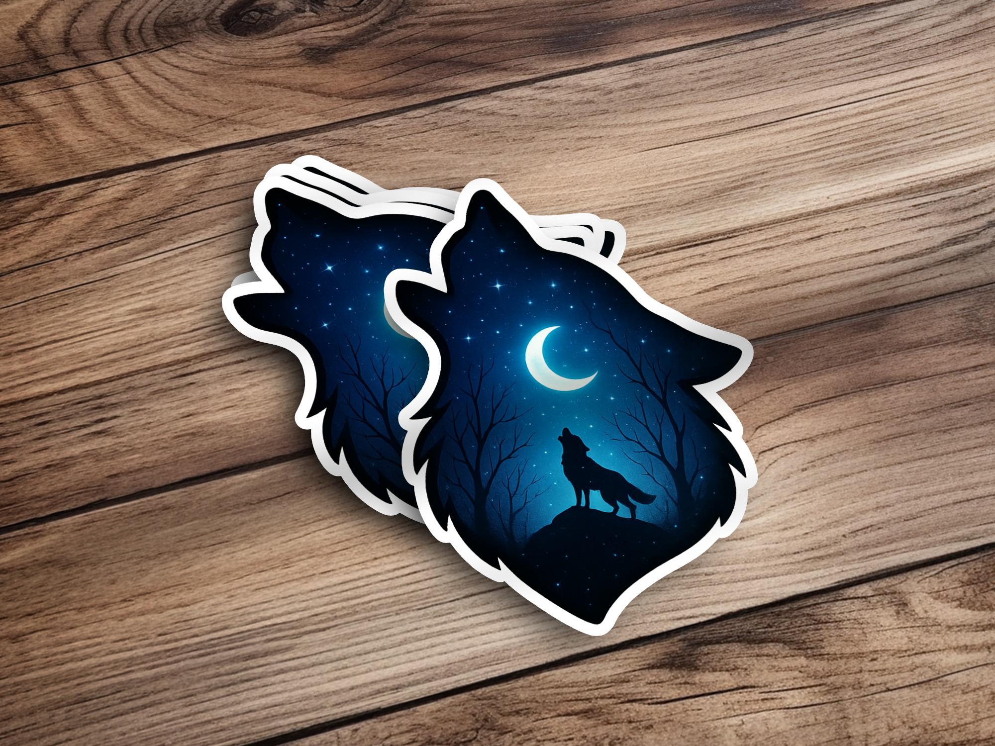 This wolf moon night sky glossy die cut sticker brings a little wild, star filled magic to your everyday essentials. Shaped like a wolf’s head with a silhouetted wolf howling at a crescent moon, it instantly adds mystery, calm, and wanderlust to any surface.