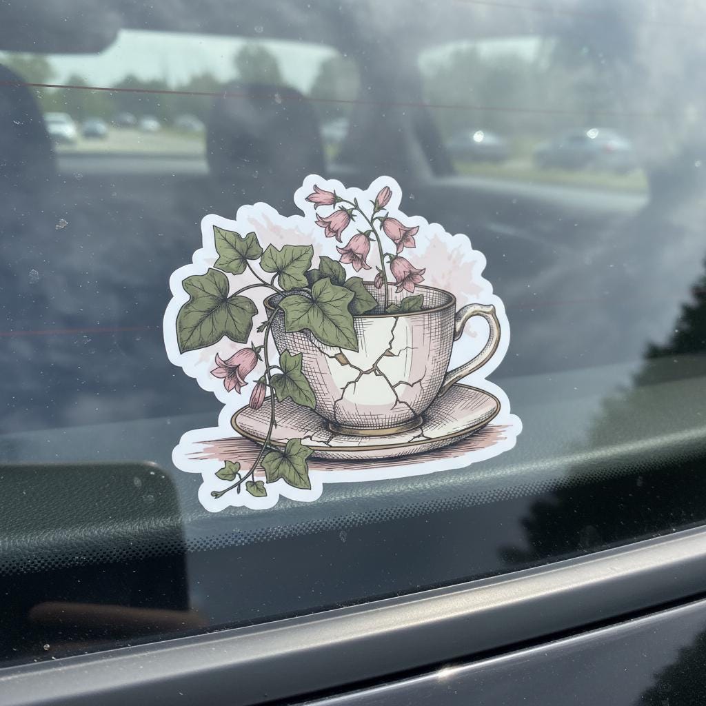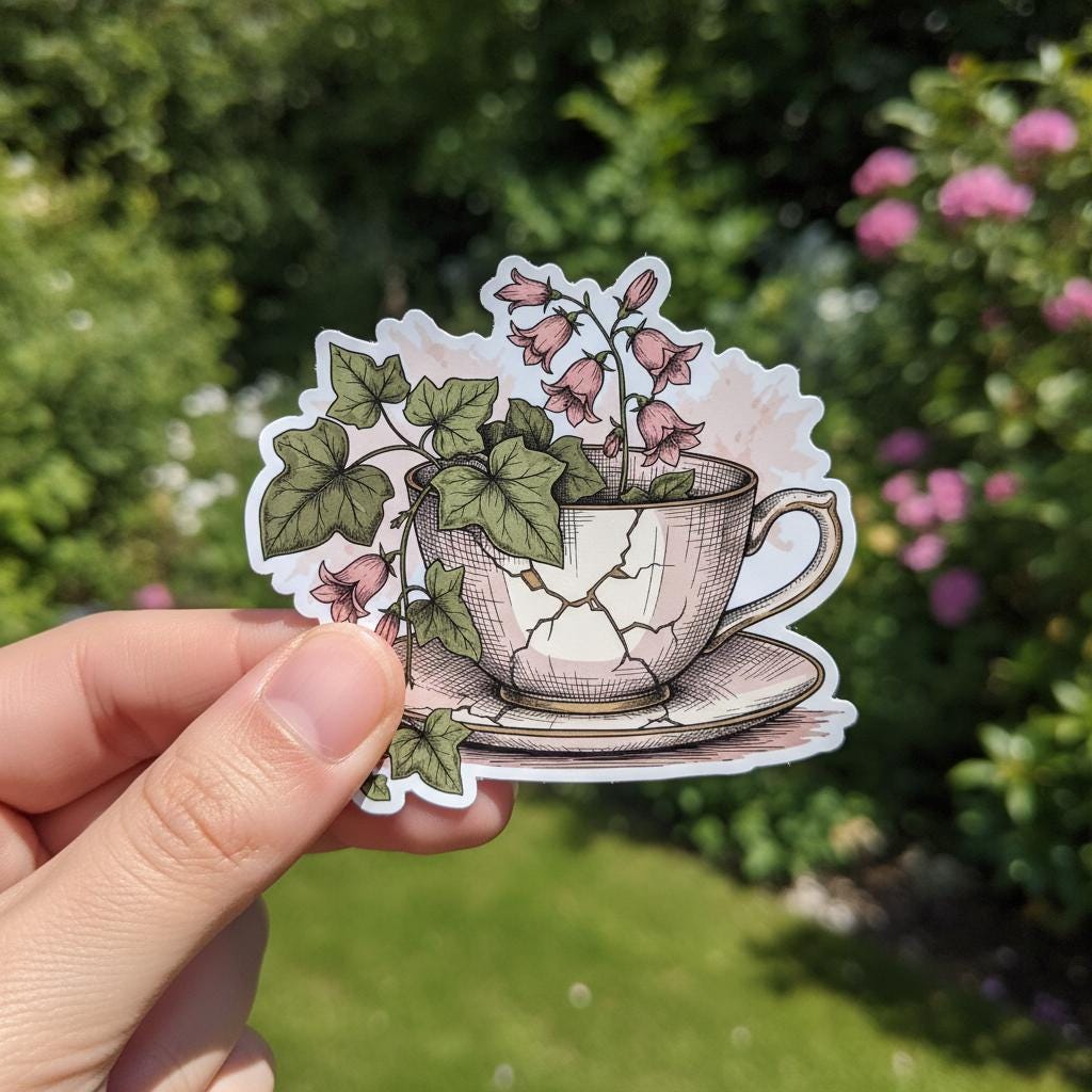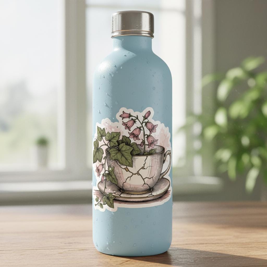 Bring timeless charm to your space with this botanical teacup sticker, featuring a hand-illustrated cracked china cup overflowing with pink bellflowers and ivy. This glossy vinyl piece blends vintage elegance and natural beauty, perfect for journaling, laptops, water bottles, or scrapbooks.