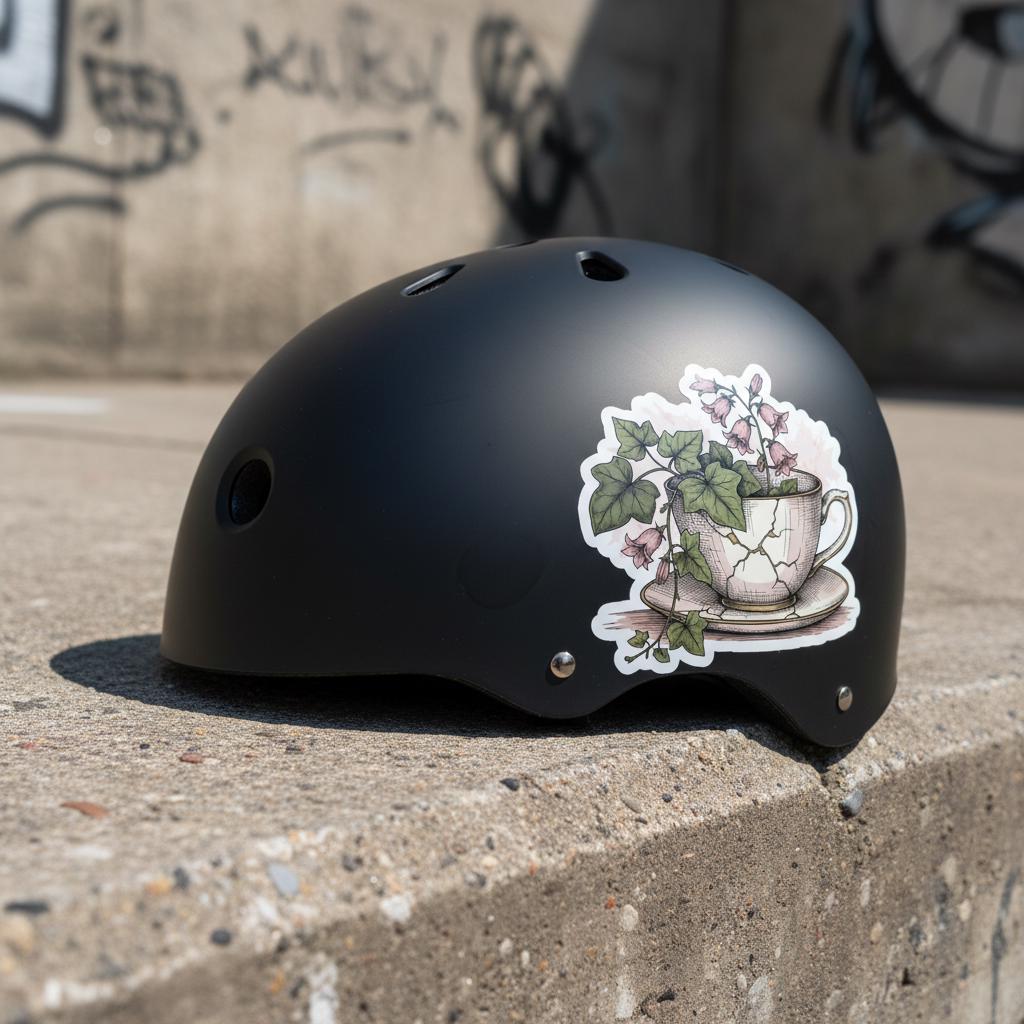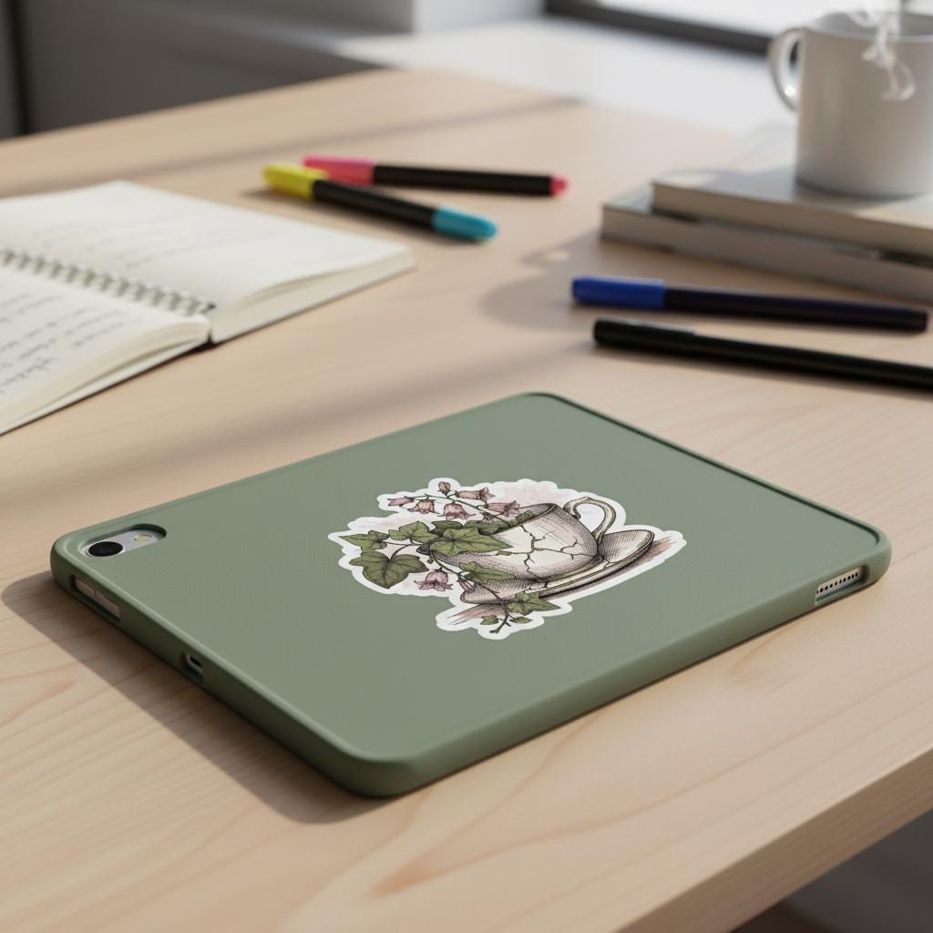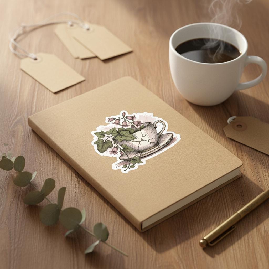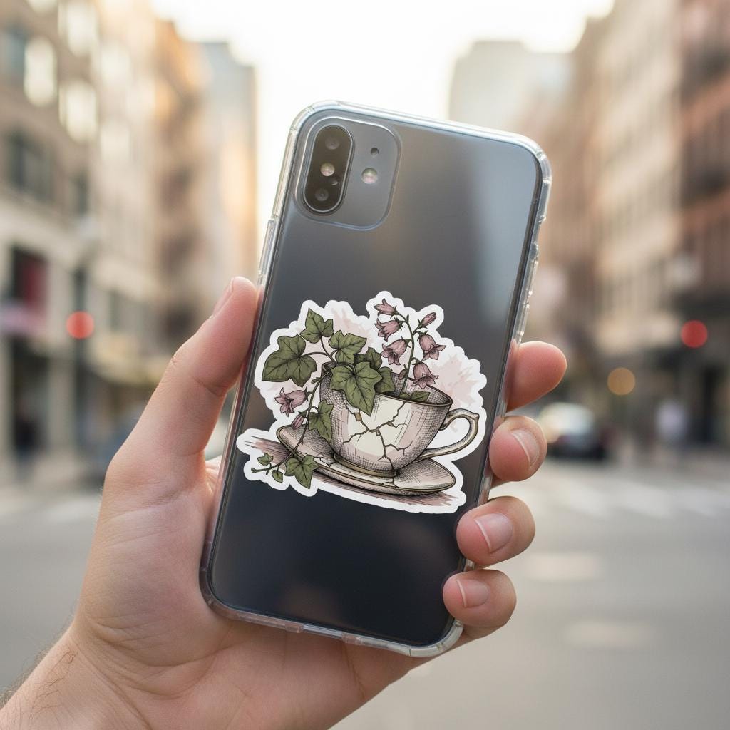 Bring timeless charm to your space with this botanical teacup sticker, featuring a hand-illustrated cracked china cup overflowing with pink bellflowers and ivy. This glossy vinyl piece blends vintage elegance and natural beauty, perfect for journaling, laptops, water bottles, or scrapbooks.