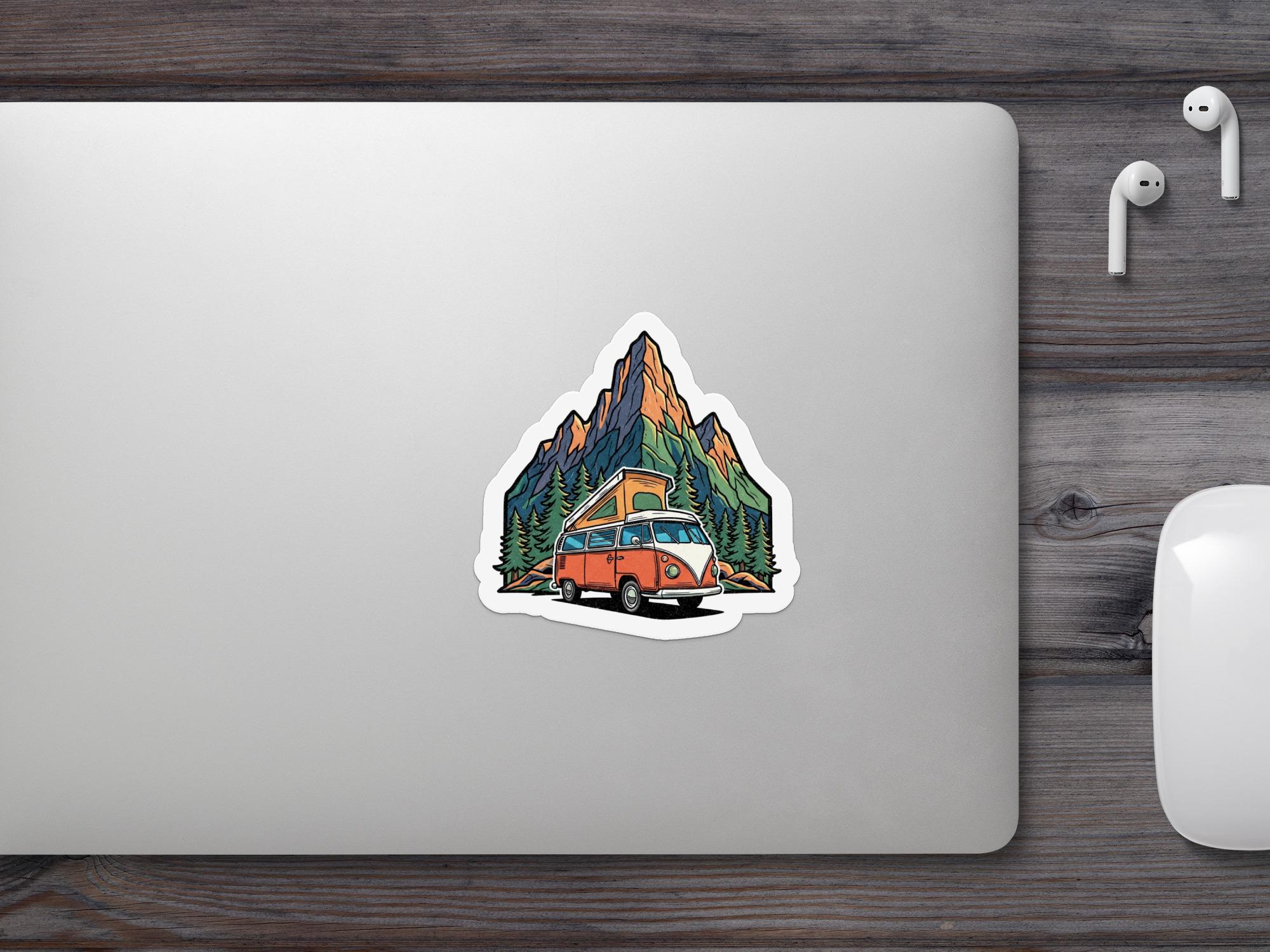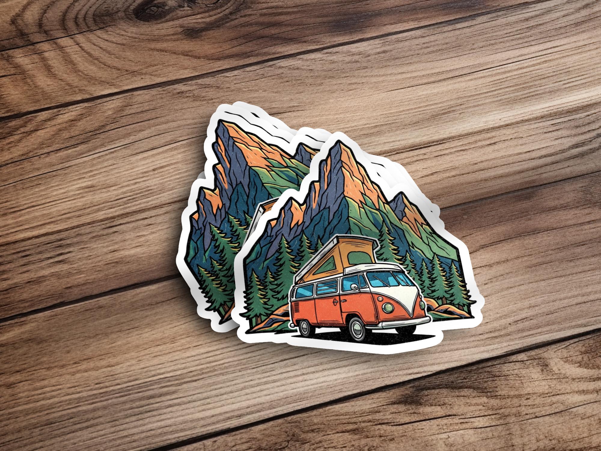 Bring your wanderlust to life with this Mountain Vanlife Vinyl Sticker, featuring a retro camper beneath vibrant alpine peaks. This glossy, waterproof vinyl decal adds a punch of personality to your laptop, water bottle, travel journal, or car.
