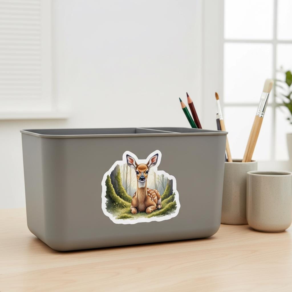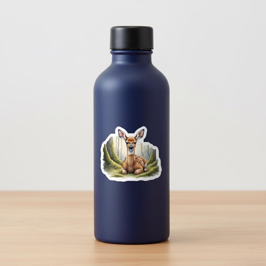 Crafted on durable, waterproof, weather-resistant vinyl, it holds up beautifully indoors and outdoors—perfect for nature lovers, artists, hikers, students, and anyone who loves cute forest aesthetics. Its glossy finish enhances the artwork’s depth, giving the fawn’s gentle expression and forest colors a premium look.