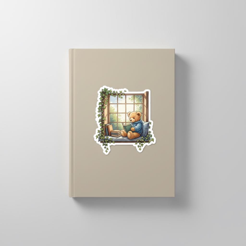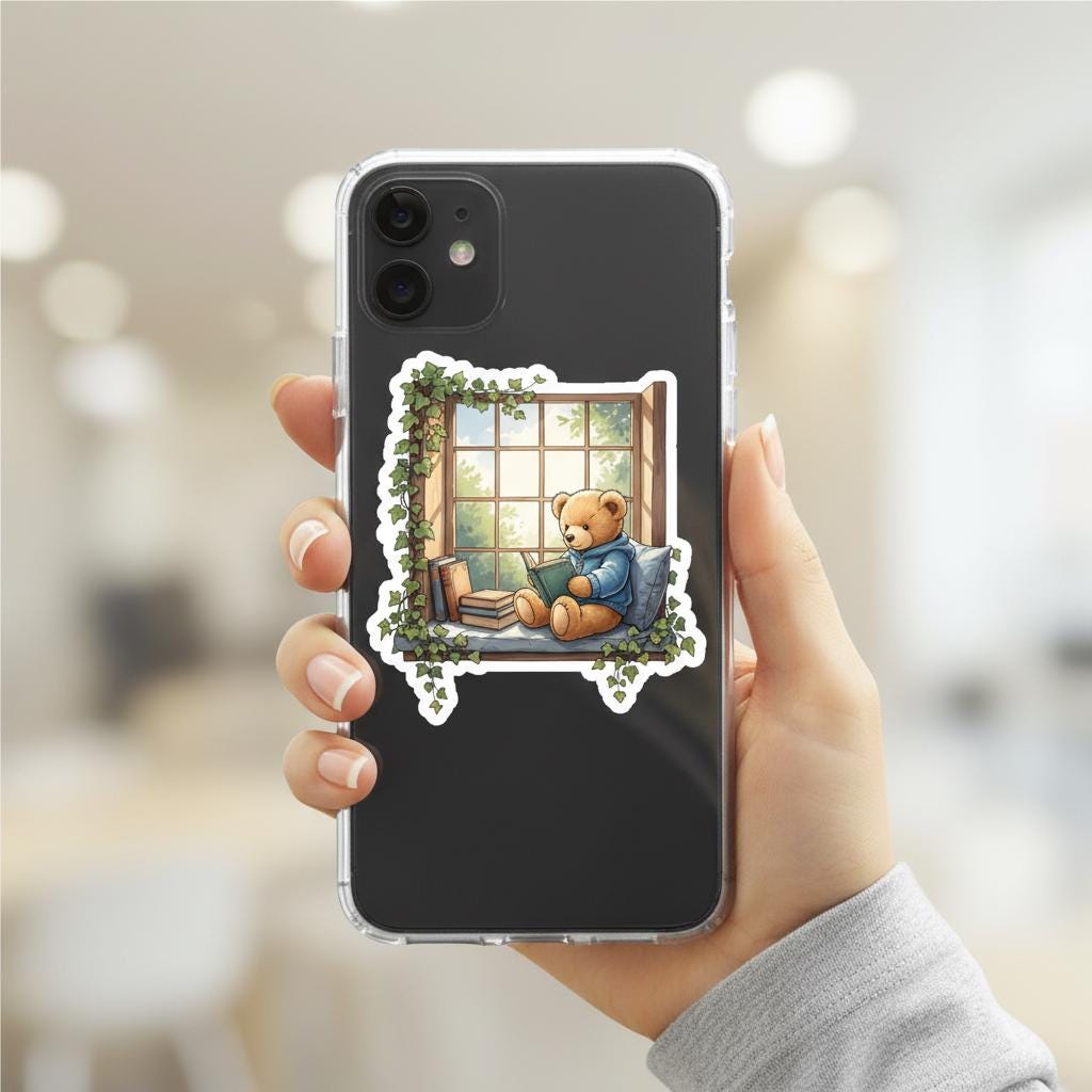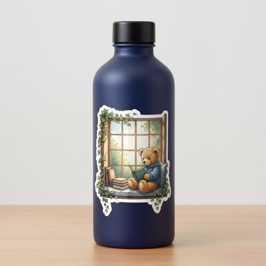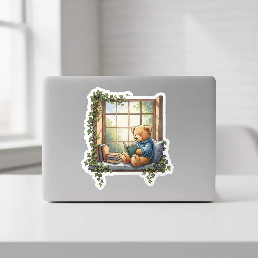 Add a warm touch of cottage comfort to your favorite surfaces with this glossy teddy bear reading sticker, featuring an illustrated bear curled up in a window nook surrounded by books and trailing ivy. Soft sunlight and cozy textures make this design perfect for book lovers, journalers, and anyone who appreciates whimsical, comforting art.