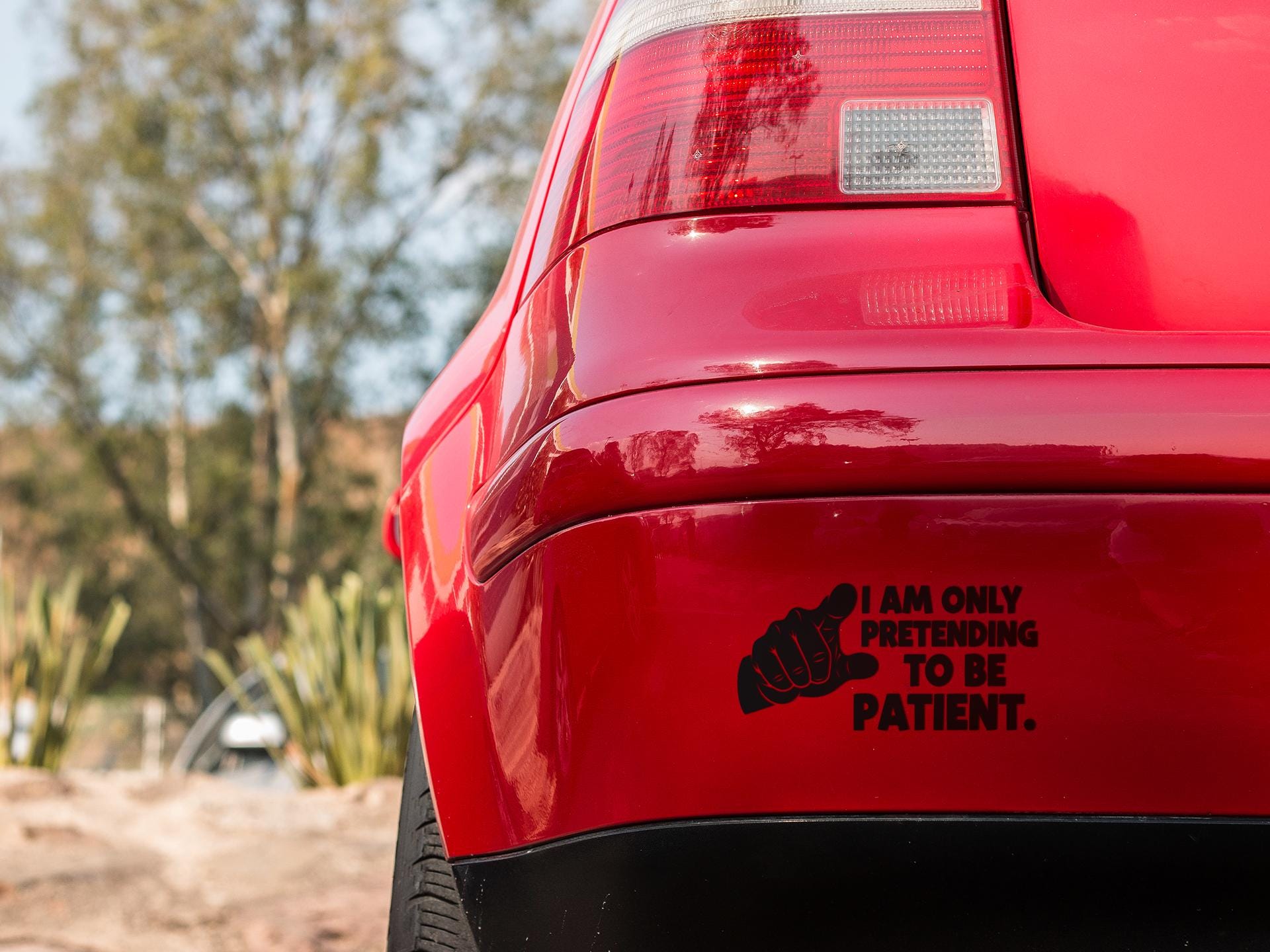 Inject your ride with a bold statement — this funny car vinyl decal features a striking black hand graphic and the unapologetically honest phrase: “I Am Only Pretending To Be Patient.”