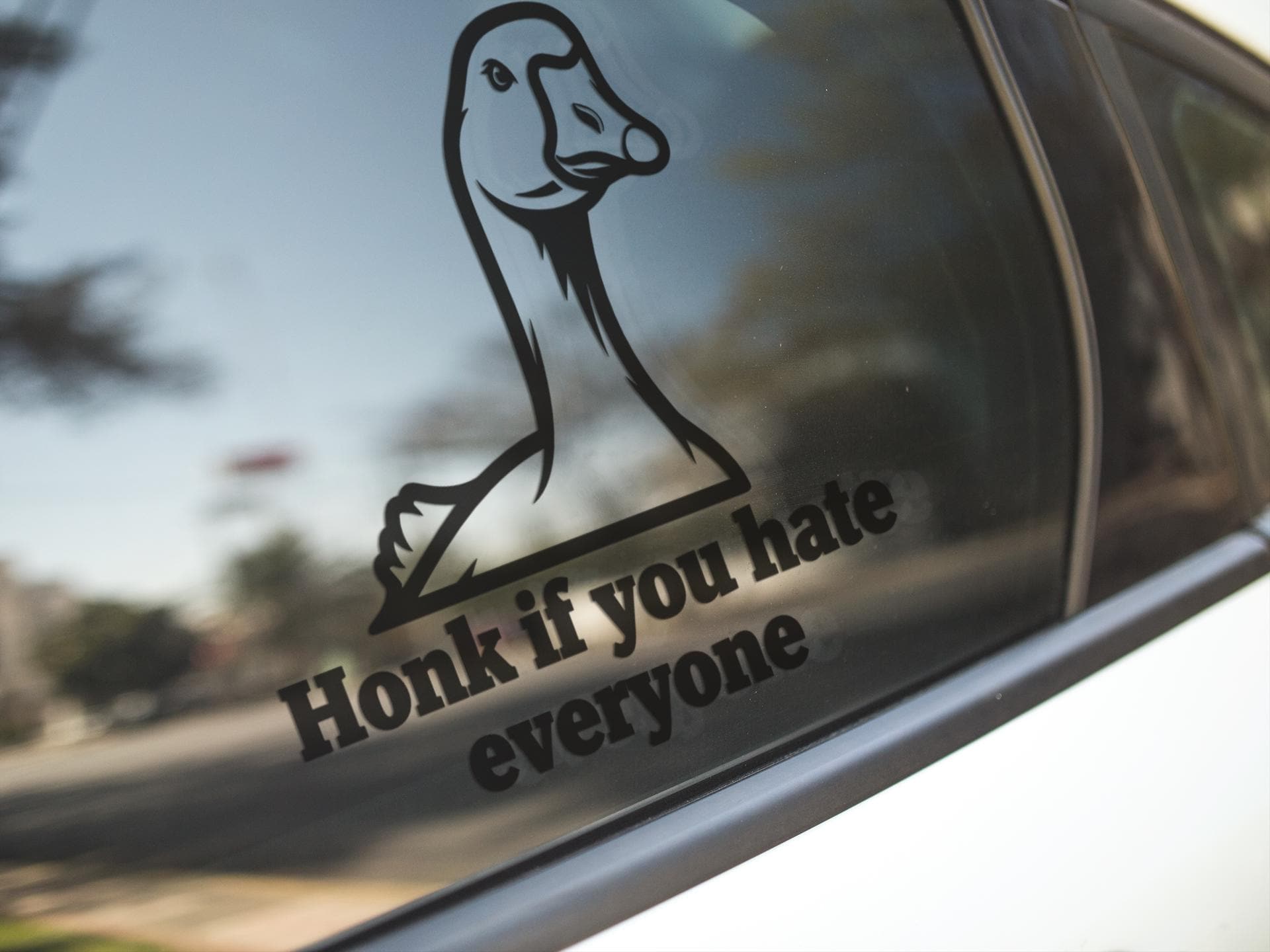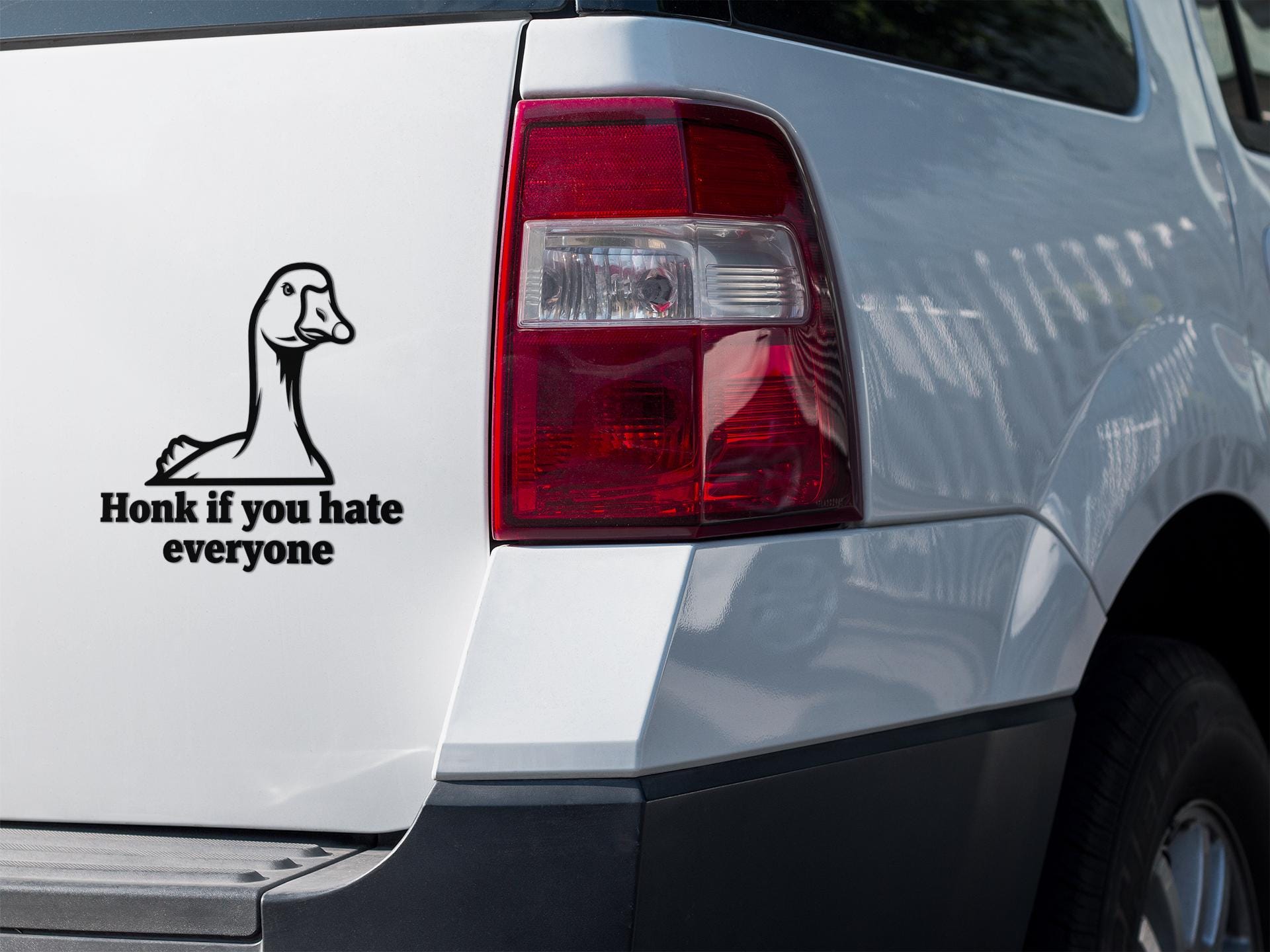 This glossy vinyl car decal features a bold goose graphic with the “Honk if you hate everyone” quote—made for drivers who prefer sharp humor over small talk. It’s a clean, high-impact design that adds instant personality to your ride and lets your mood speak for you.