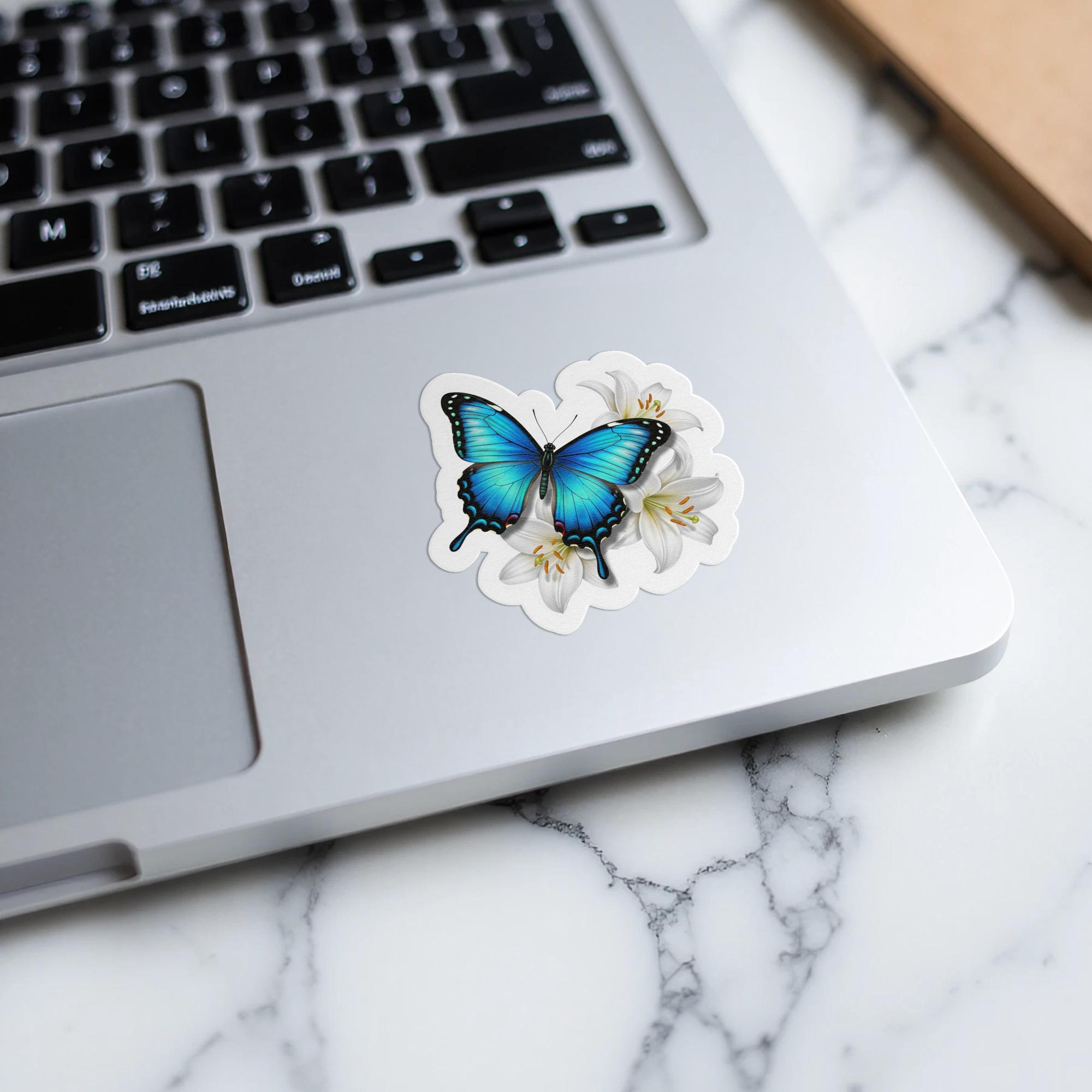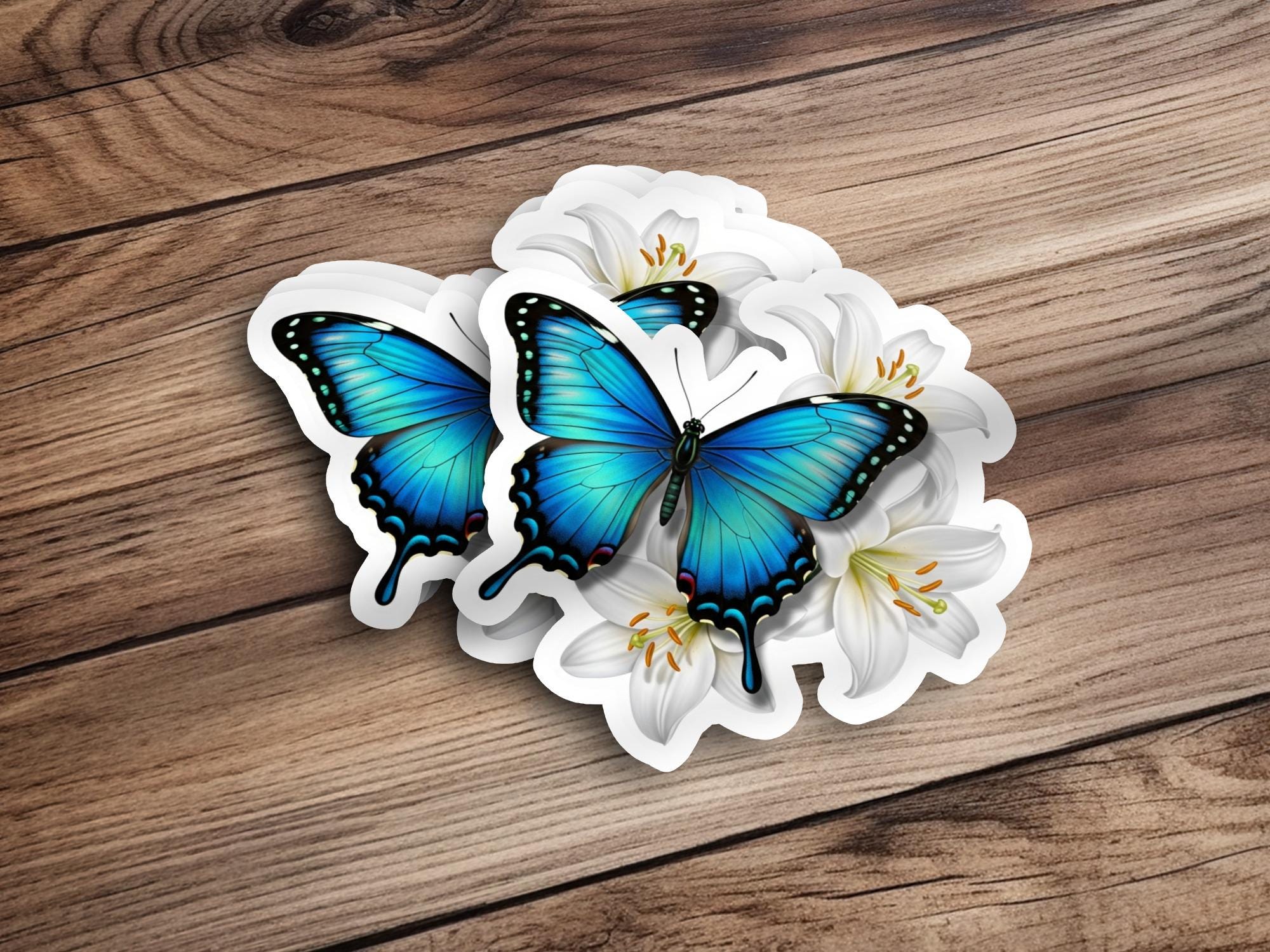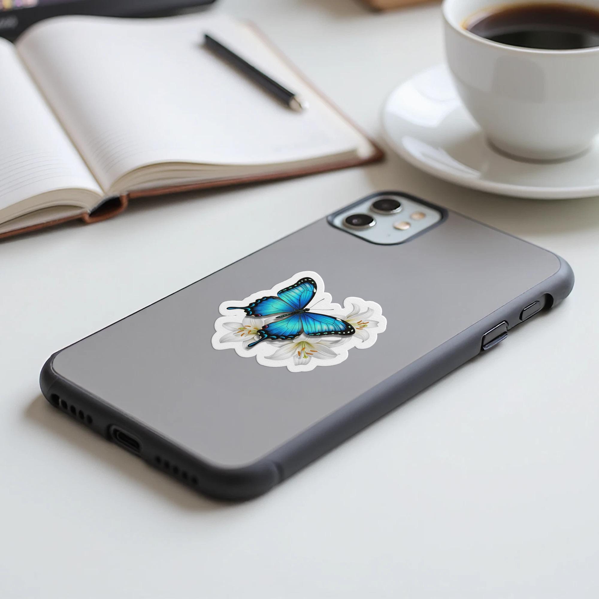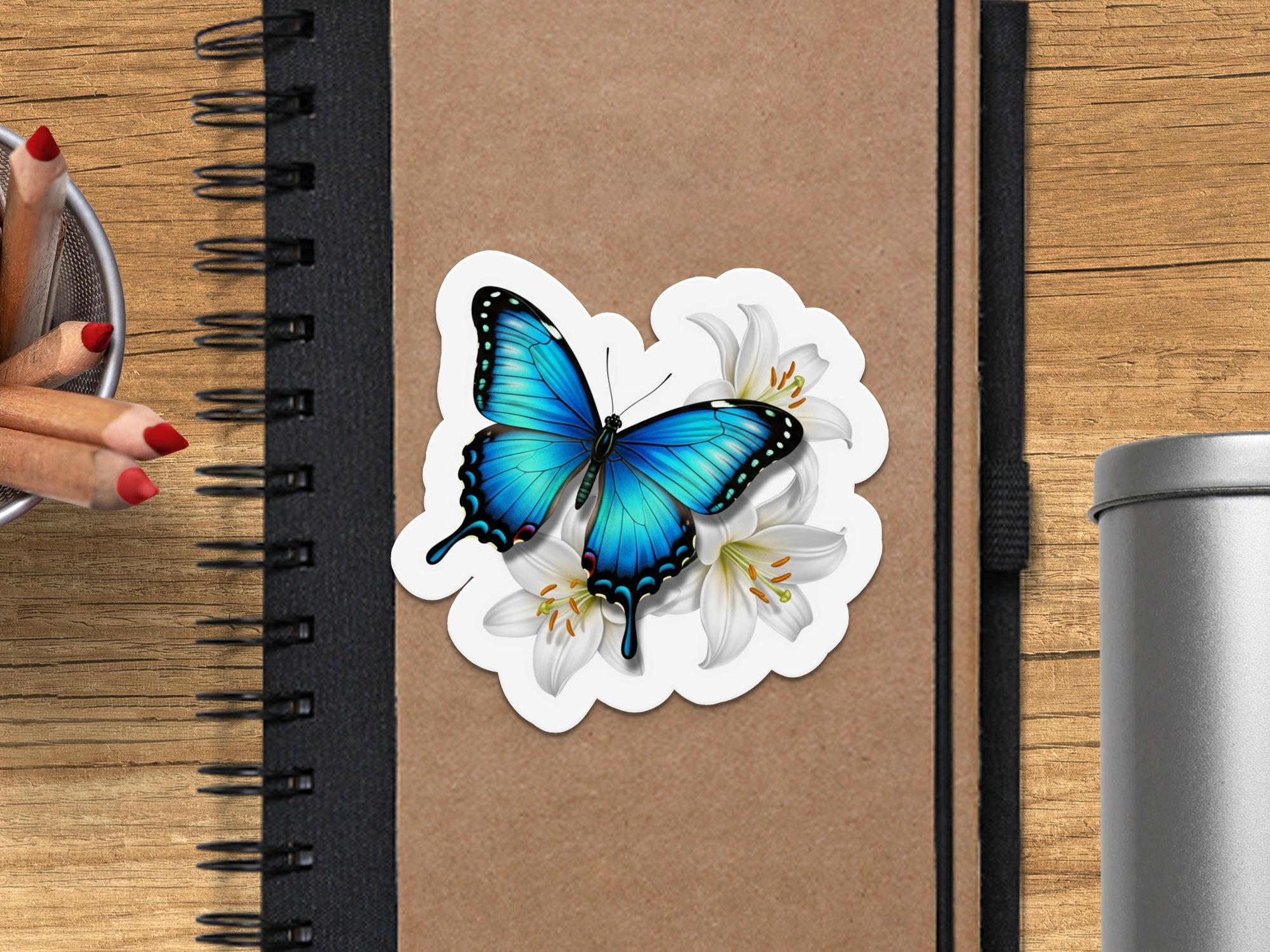 Add a touch of elegance and nature to your everyday items with this stunning Blue Butterfly and White Lily Sticker.
