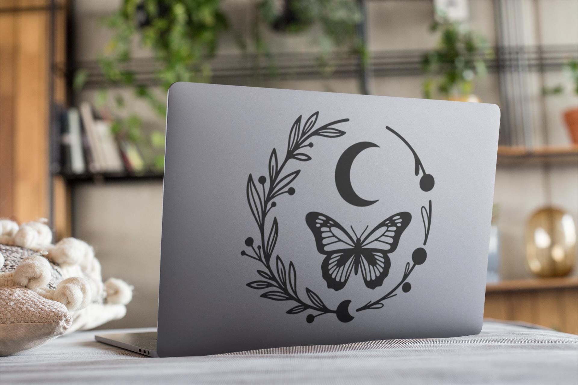 Design: Line-art style butterfly with crescent moon and floral wreath elements.