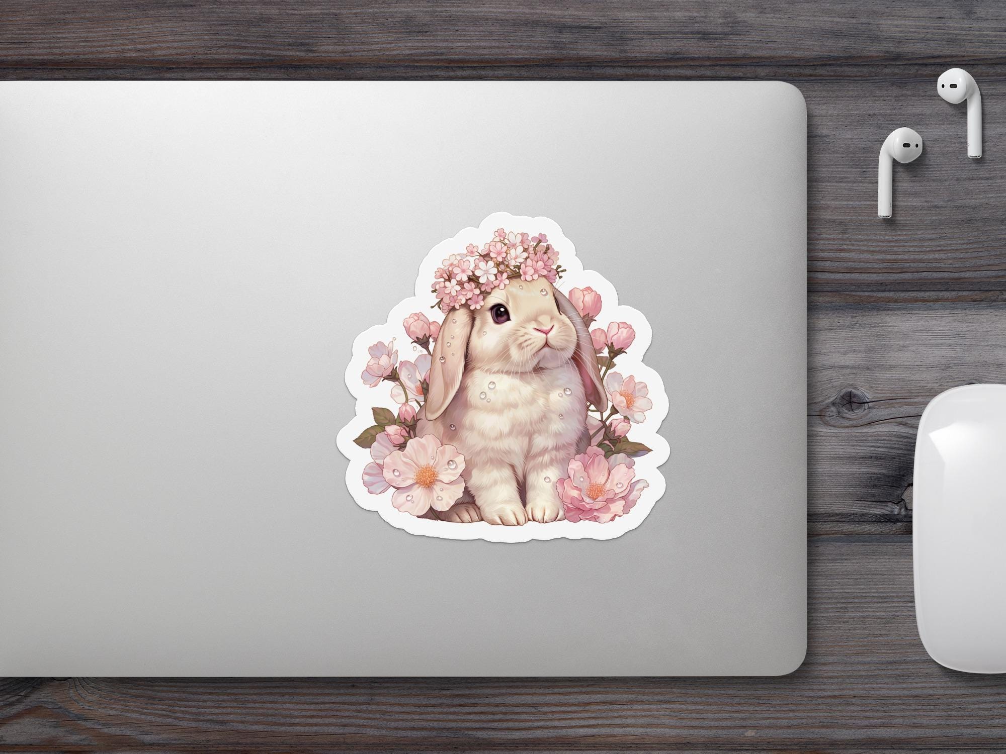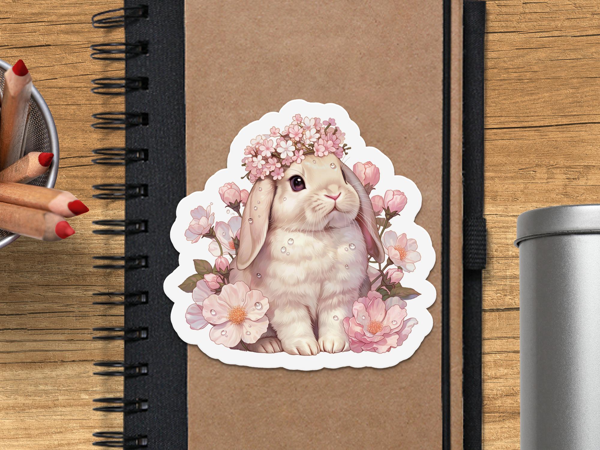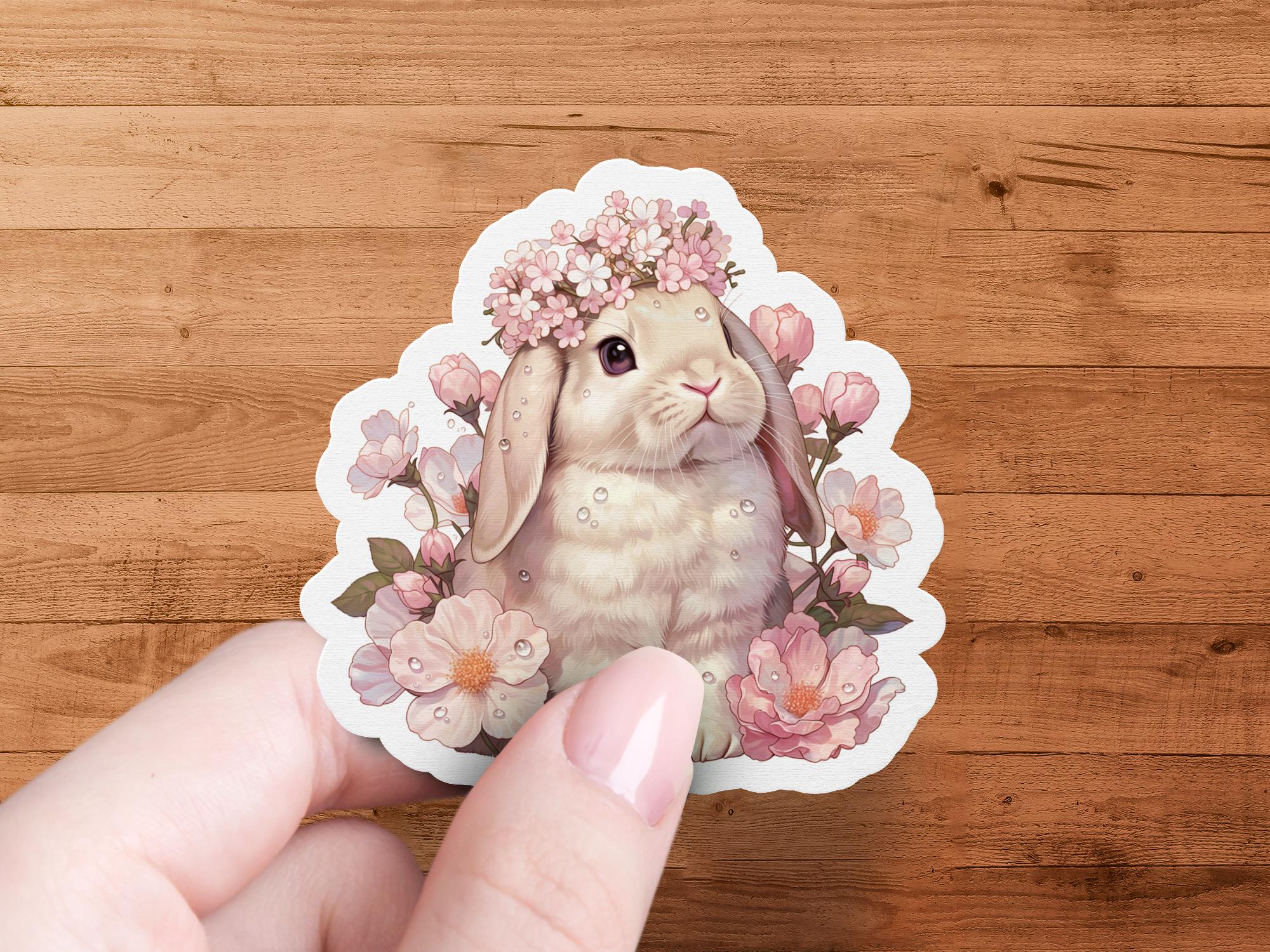 The decal features a sweet lop bunny wearing a crown of flowers, surrounded by cherry blossoms. The artwork captures the bunny's gentle expression and the delicate details of the floral arrangement. The sticker is ideal for anyone who appreciates cute animals, floral designs, or springtime themes.