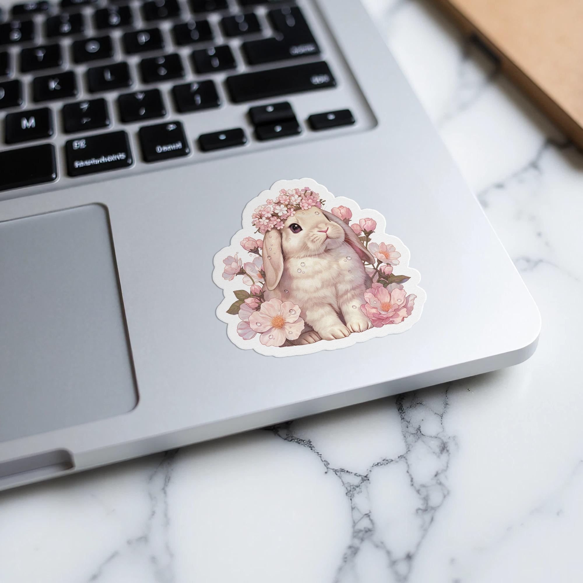 This adorable lop bunny sticker is the perfect way to add a touch of springtime charm to your life! Featuring a fluffy bunny wearing a delicate floral crown surrounded by beautiful pink blossoms, this sticker is sure to brighten up any surface. Stick it on your laptop, water bottle, planner, or anywhere else you want to add a little cuteness.