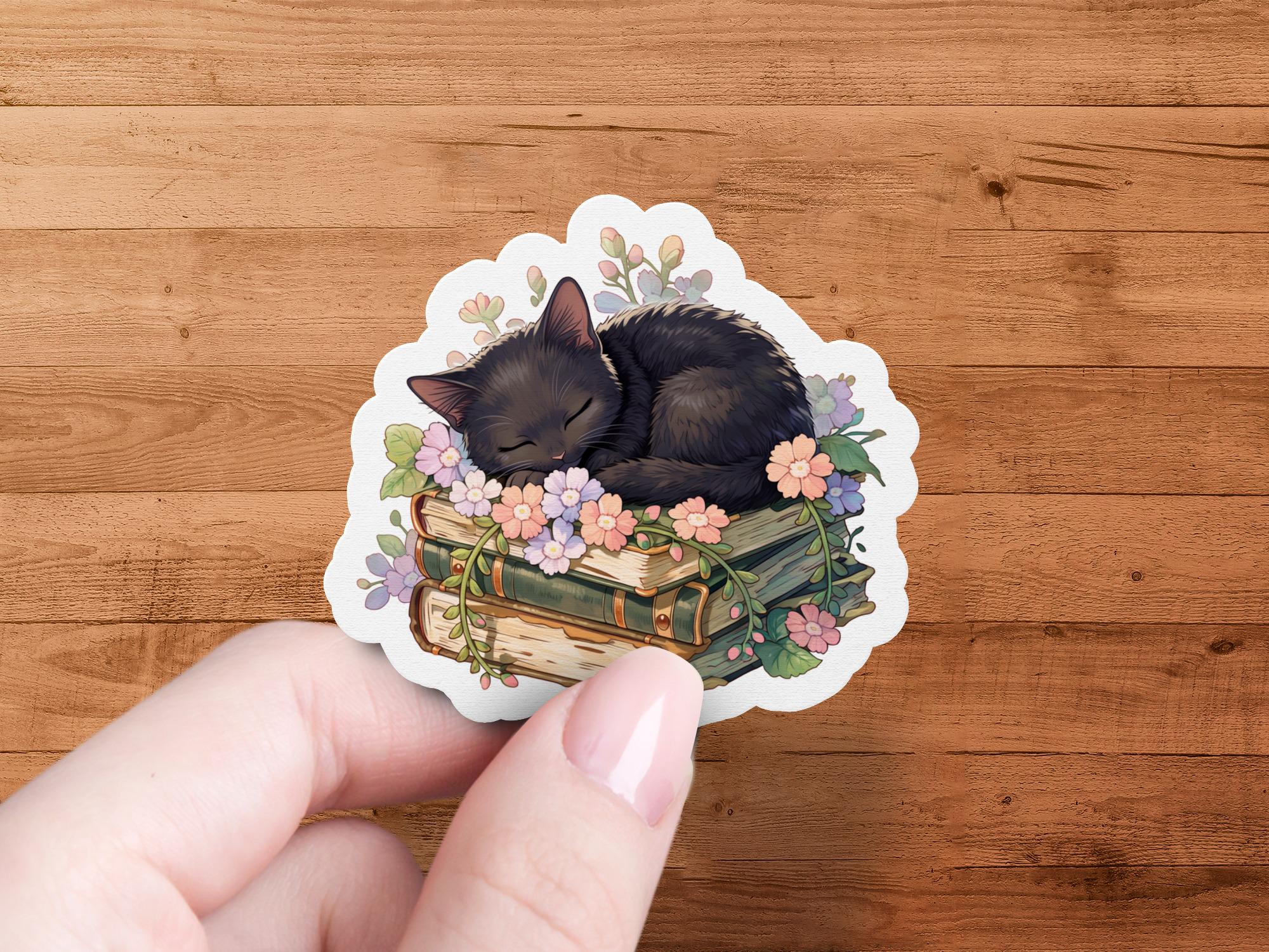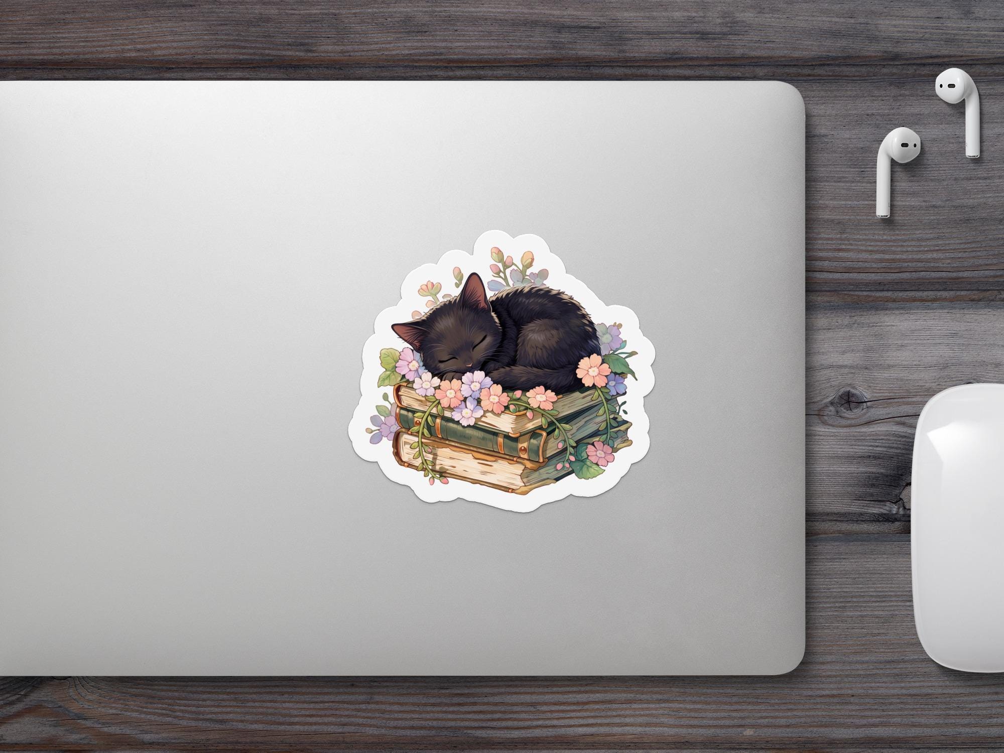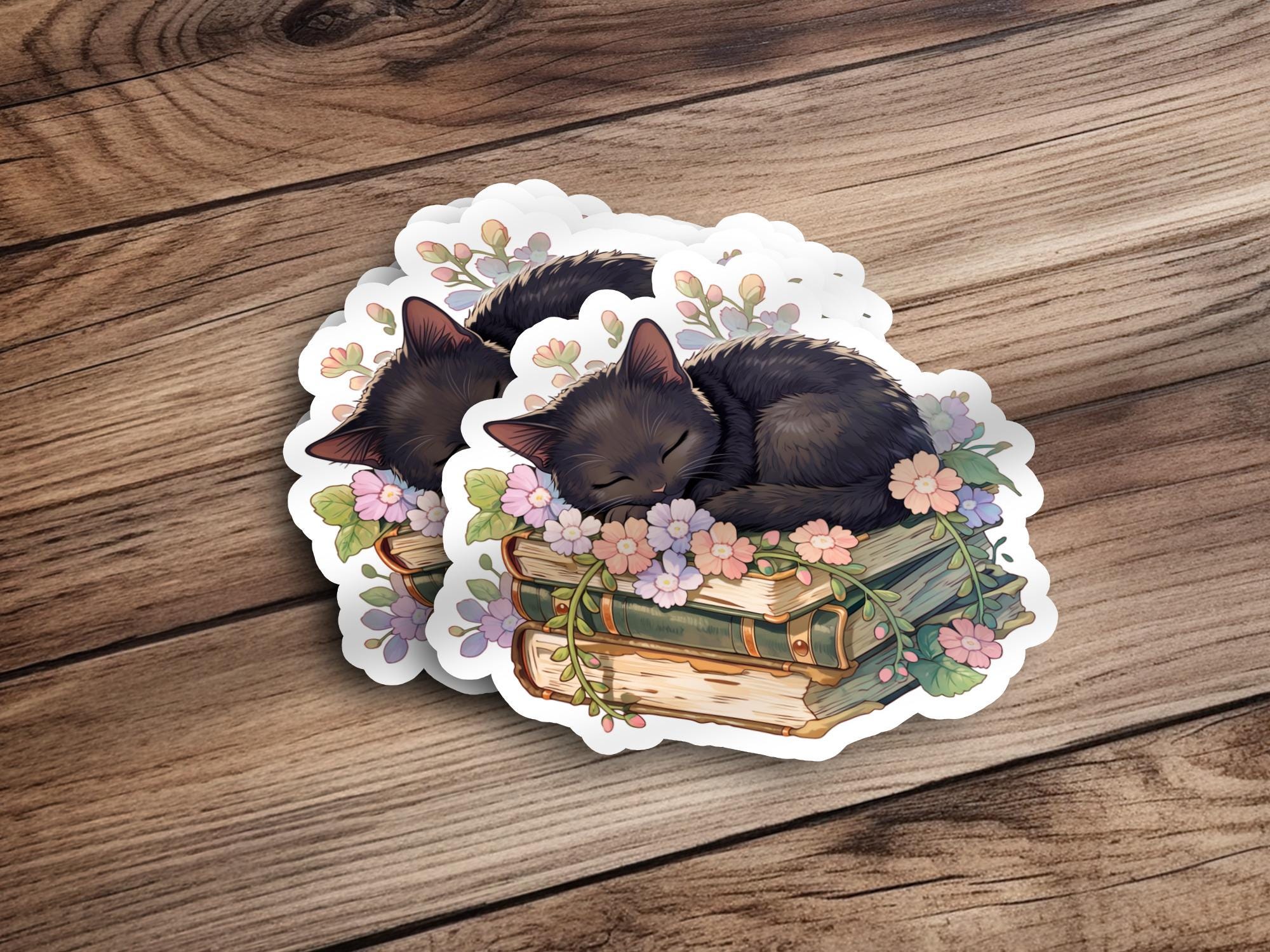 This black cat reading sticker captures the quiet magic of a sleepy kitten curled atop vintage books surrounded by delicate florals. Printed as a glossy die cut decal, it brings cozy literary charm and soft cottagecore energy to your everyday essentials.