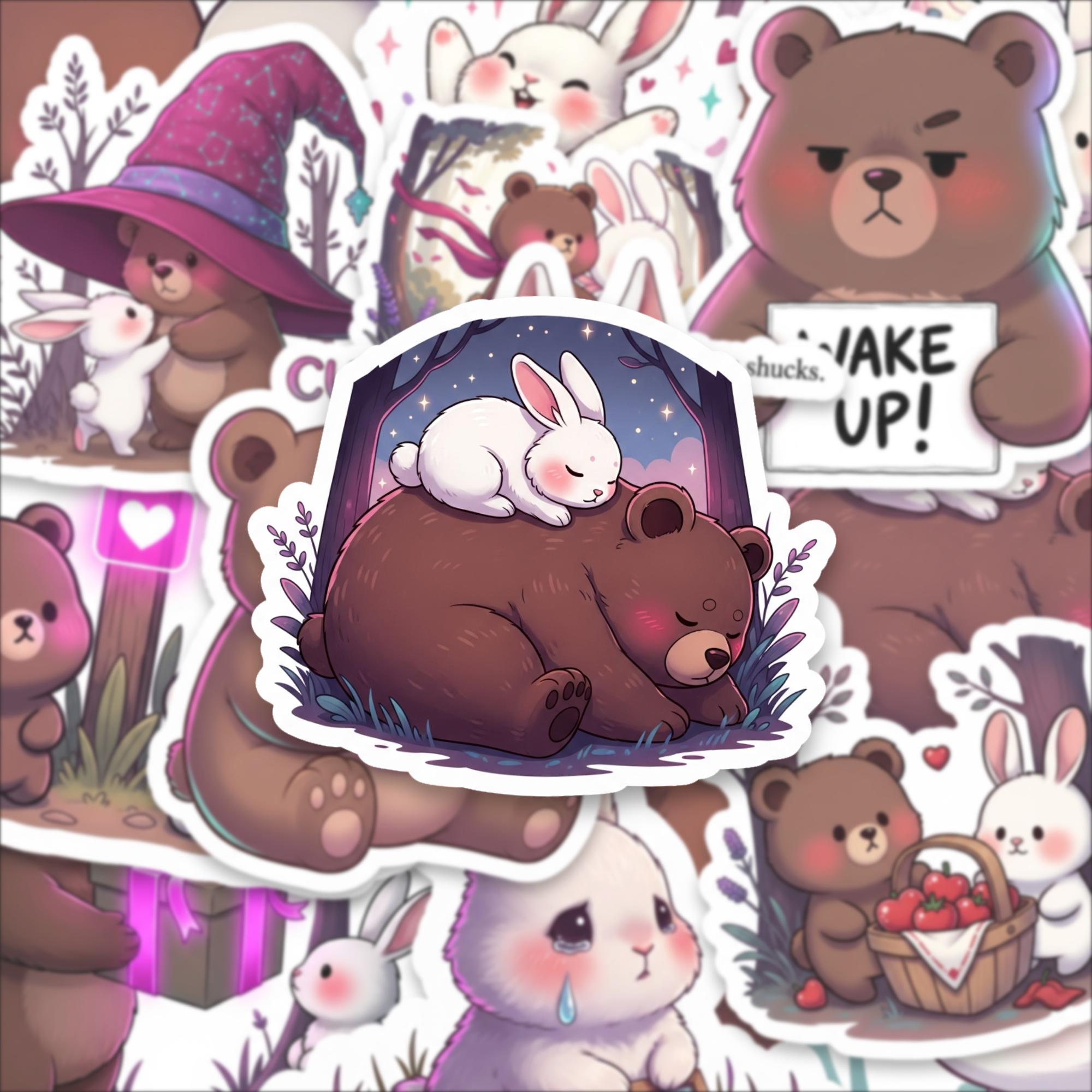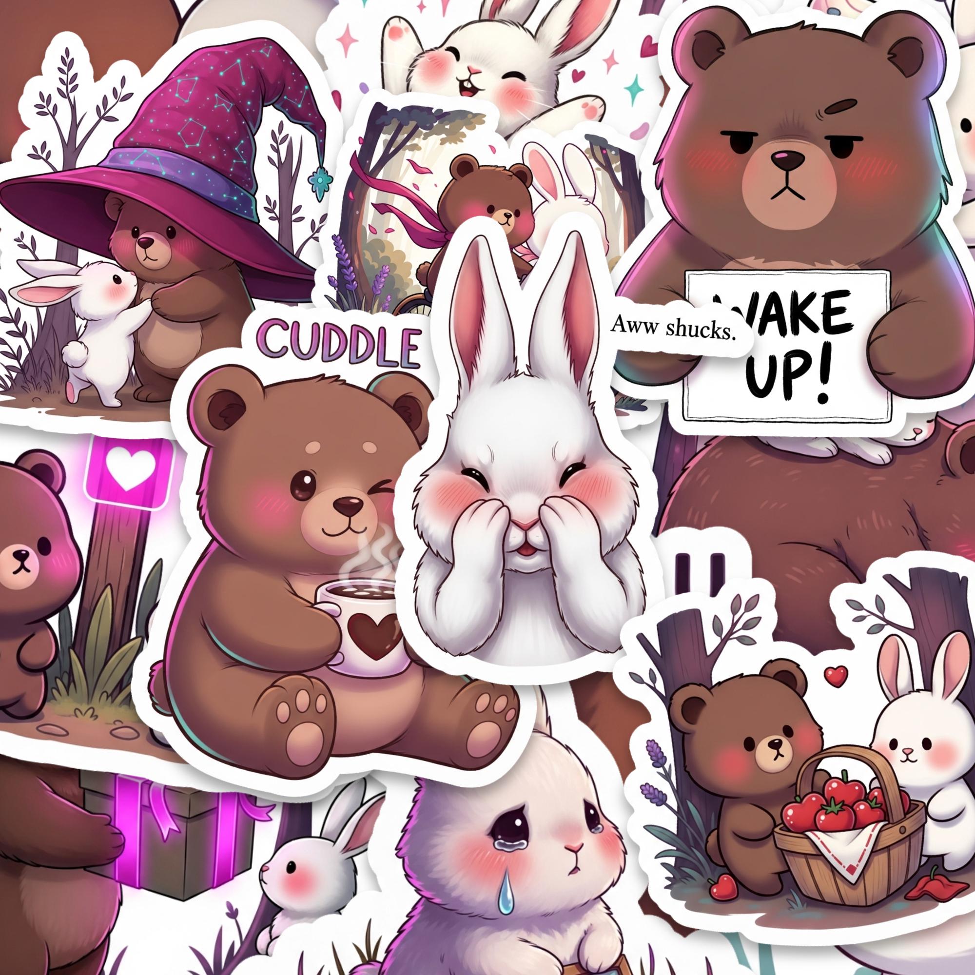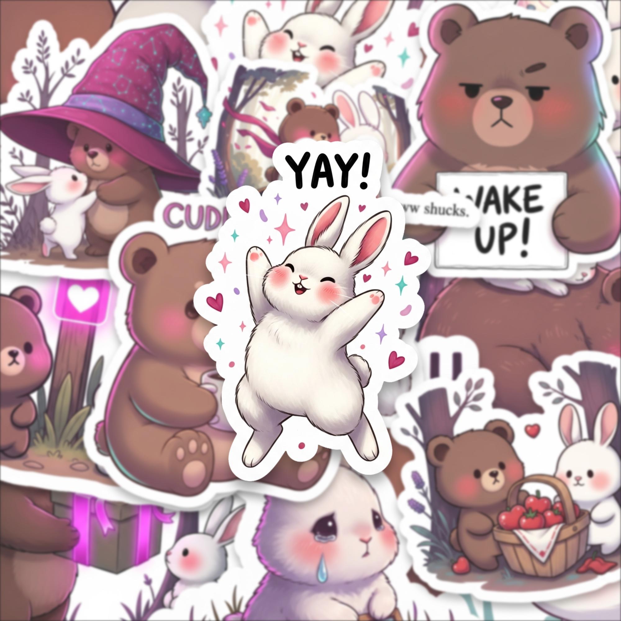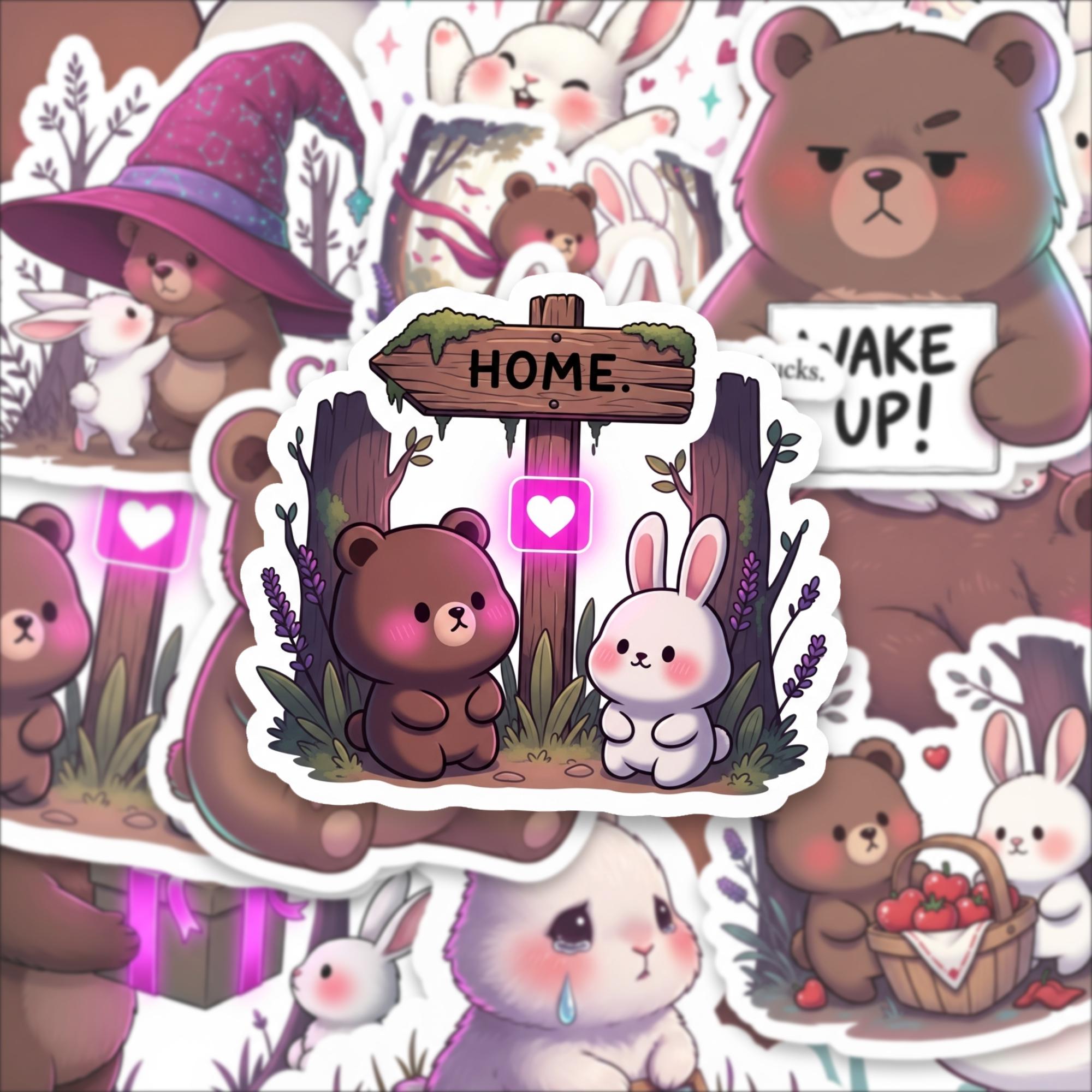 From cuddly bears holding mugs to sweet bunnies with rosy cheeks, this collection captures playful emotion and gentle storytelling in every design. The compact 2 inch size makes them perfect for layering on laptops, water bottles, journals, planners, phone cases, and scrapbooks without overwhelming your space.