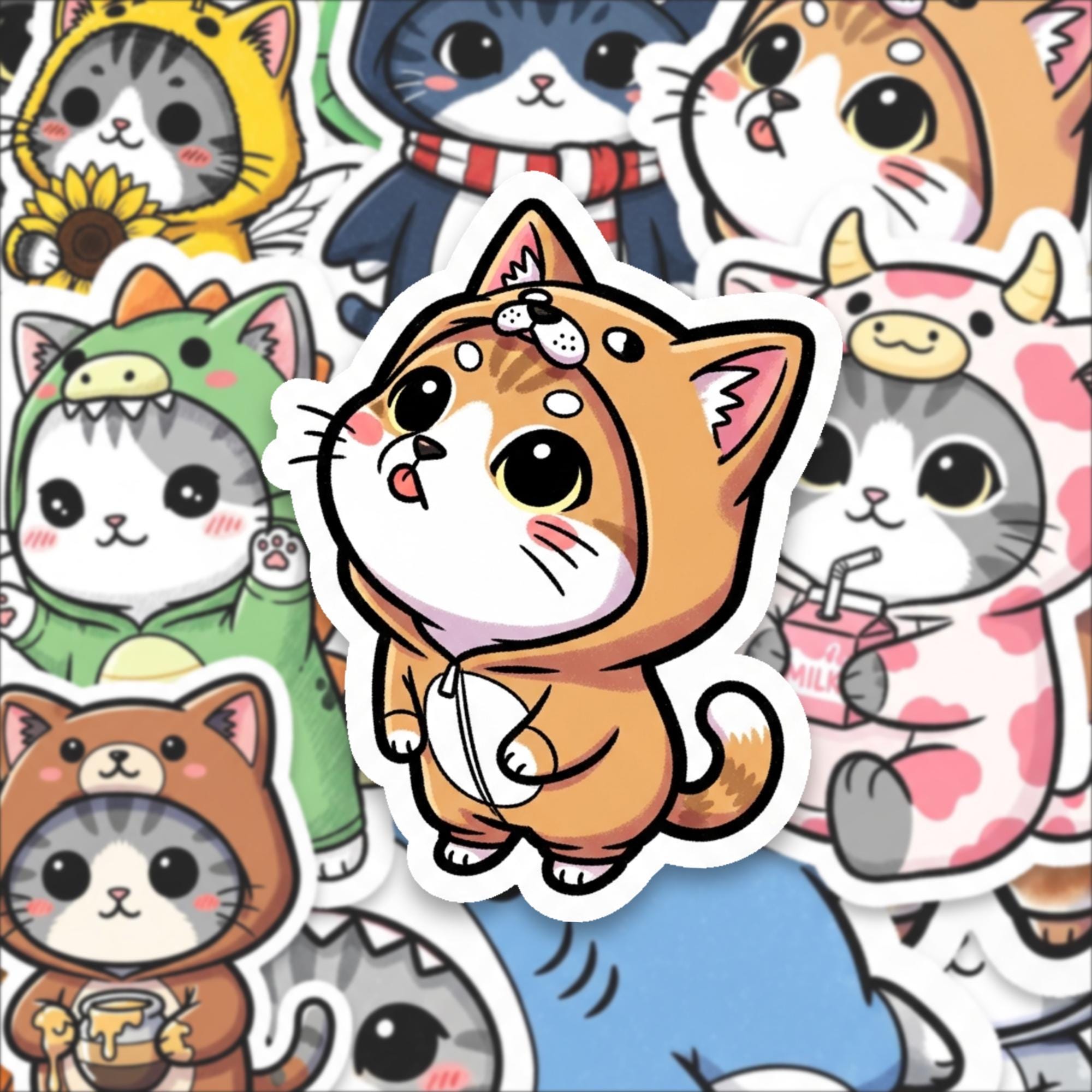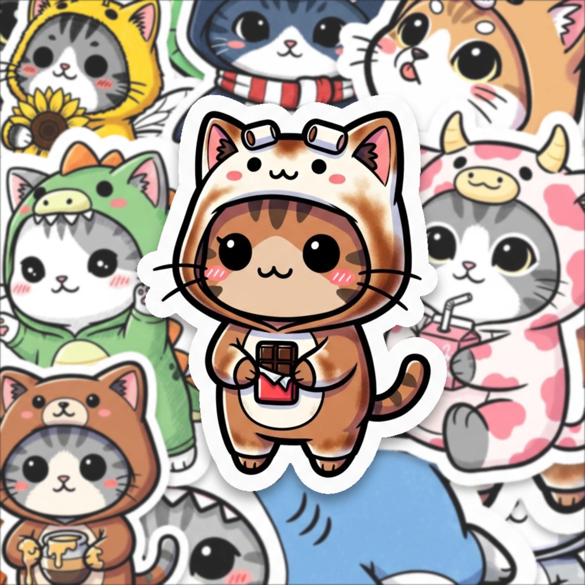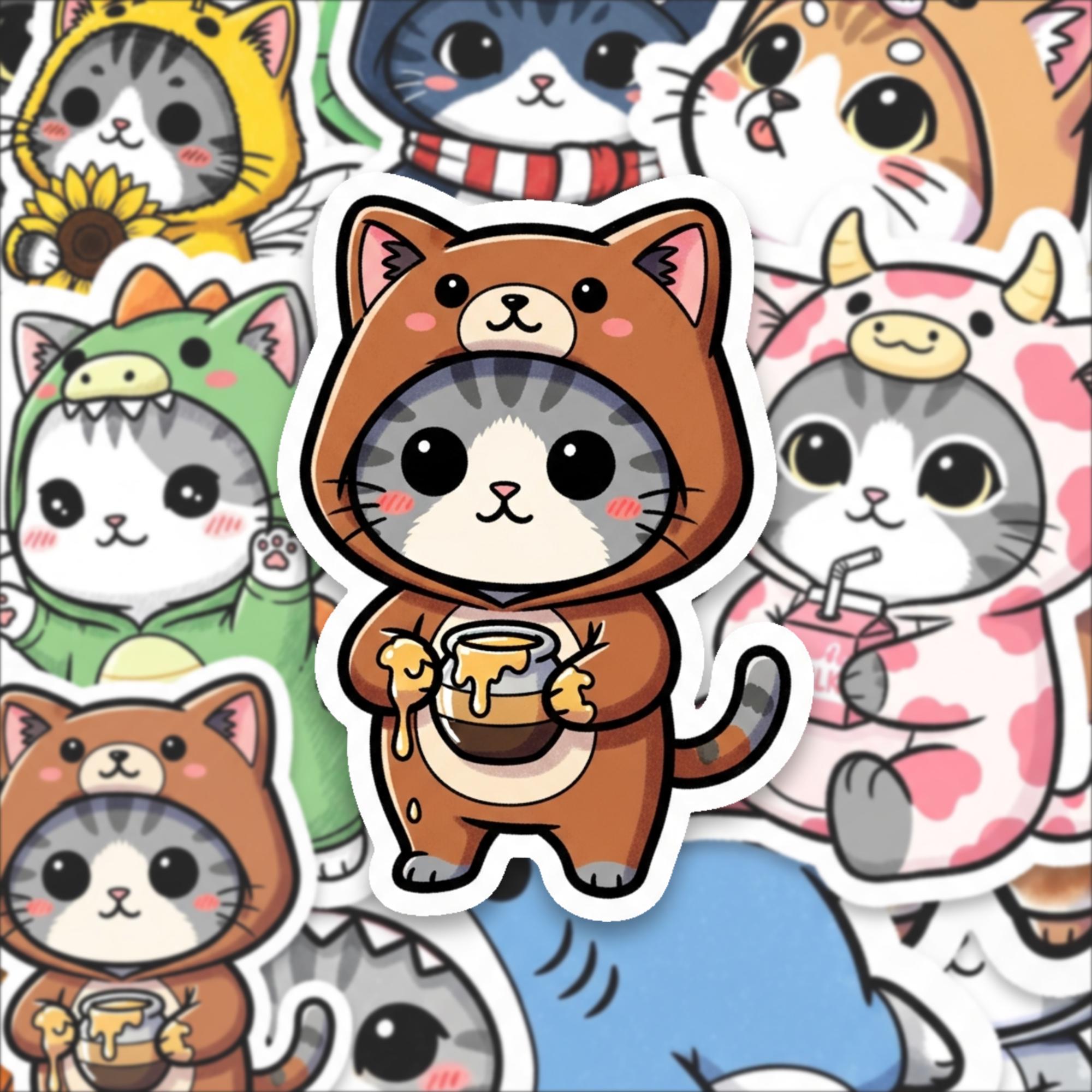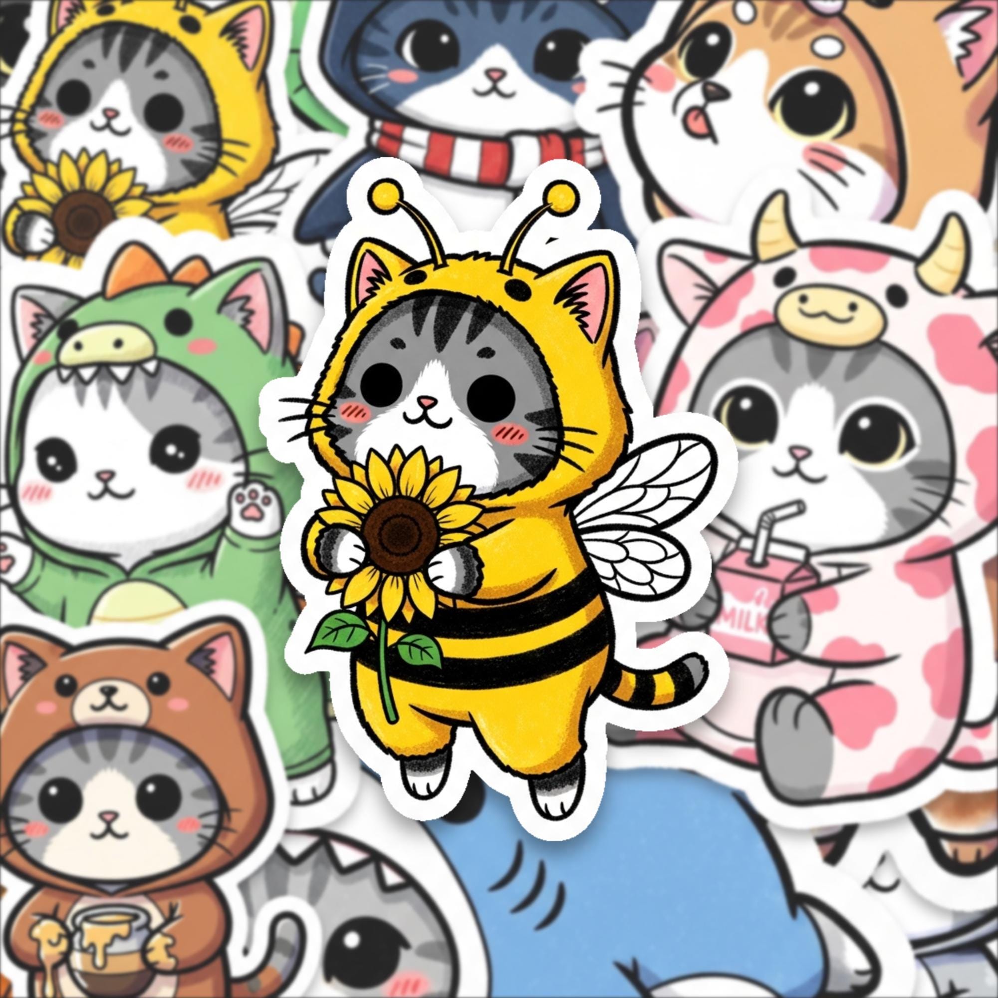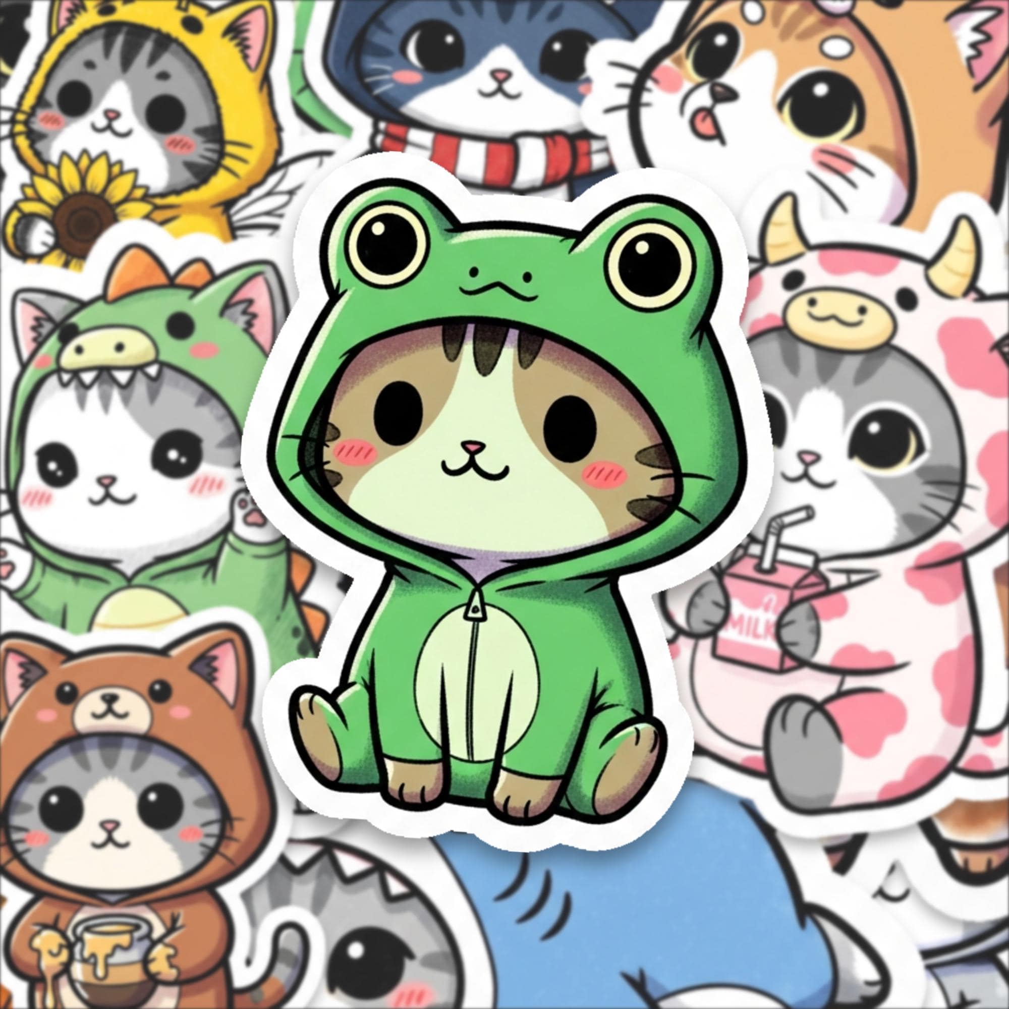 This cute cat costume sticker pack blends playful kawaii charm with glossy vinyl quality, turning everyday items into joyful expressions of personality. Each adorable cat dressed in animal outfits brings a sense of fun, warmth, and creativity to your space.